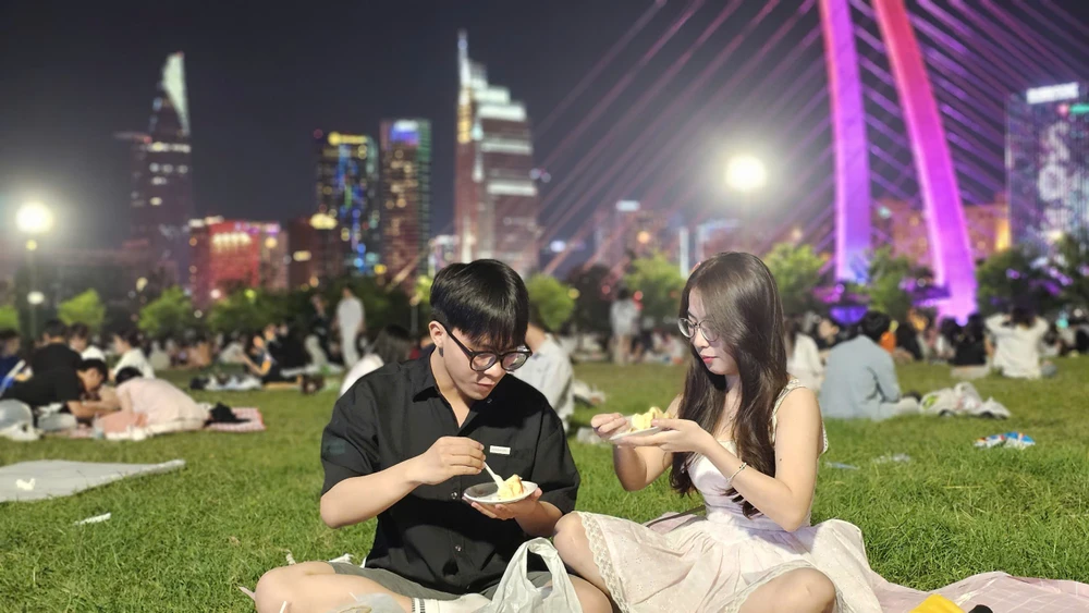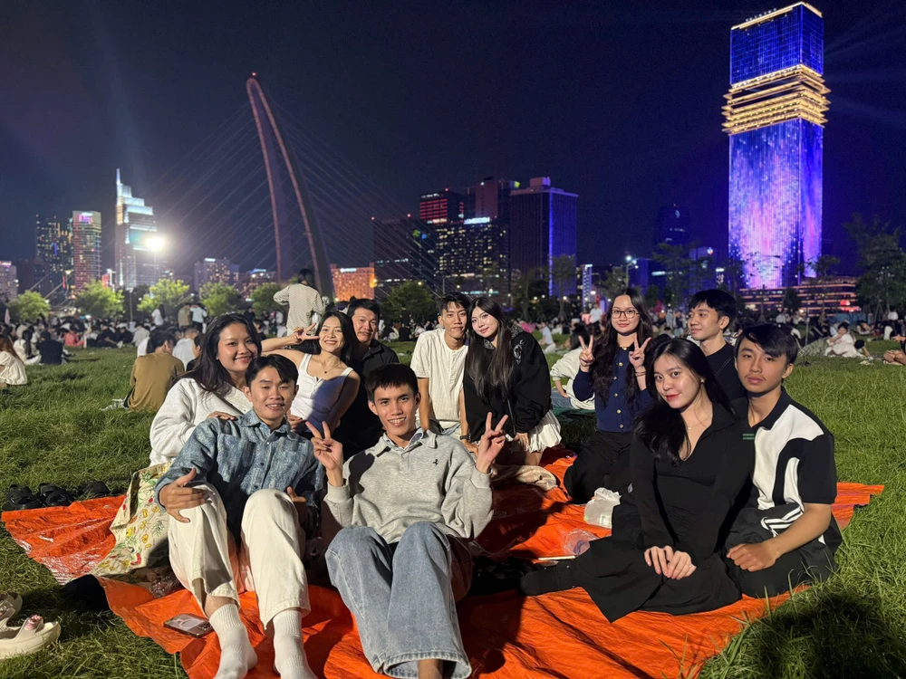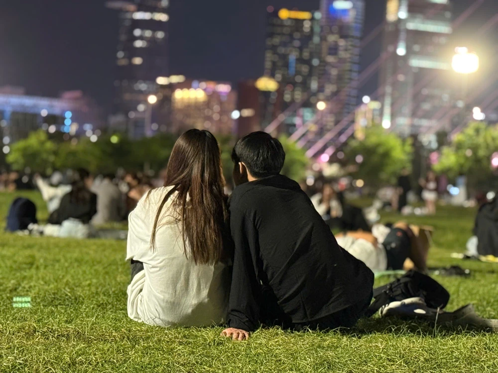 Giữa thảm cỏ xanh và ánh đèn thành phố rực rỡ, những người trẻ thả lỏng mình, nằm nghe thời gian chậm lại, chờ khoảnh khắc năm mới gõ cửa.