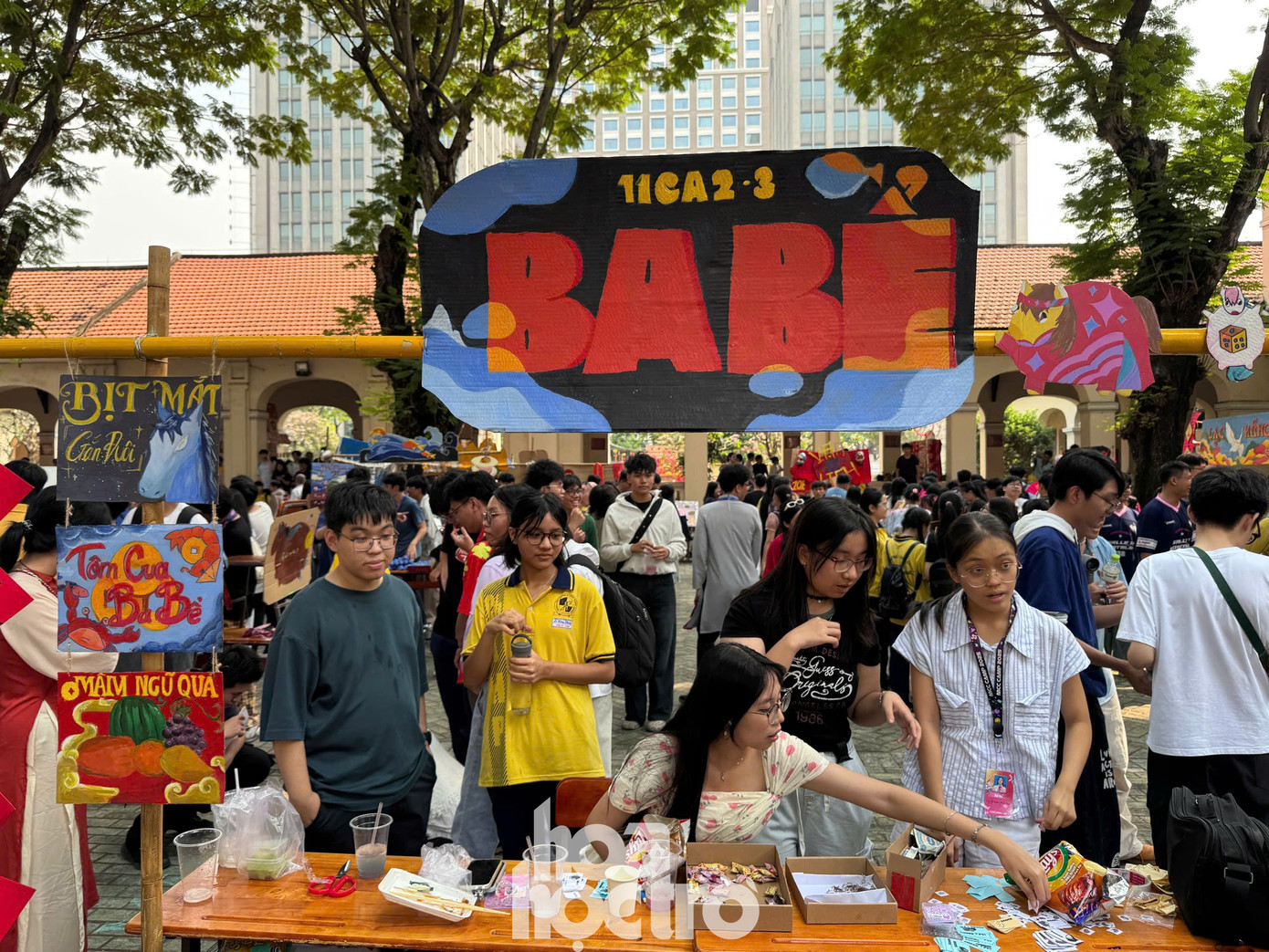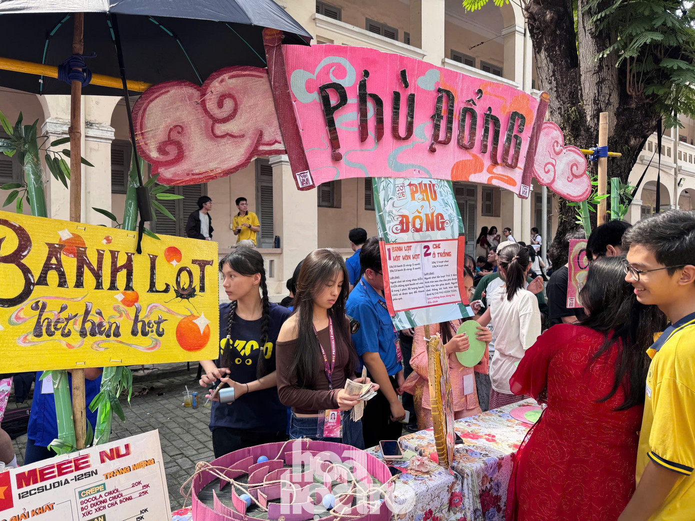 Bên cạnh đó, gian hàng trò chơi dân gian của các nhóm lớp 11 và gian hàng ẩm thực của các bạn nhóm lớp 12 cũng góp phần tạo không khí sôi động, vui tươi không kém với những ý tưởng sáng tạo. Dù đơn giản hay cầu kỳ, tất cả đều mang dấu ấn của một tập thể, thể hiện sự khéo léo và đoàn kết của các bạn học sinh.