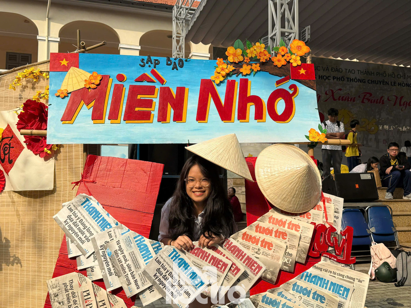 Khuôn viên nhà trường trong ngày tổ chức lễ hội cũng rực rỡ sắc xuân với hình ảnh các bạn học sinh mặc áo dài truyền thống. Khi được hỏi về cảm nhận khi tham gia lễ hội năm nay, bạn Bùi Minh Huy (Lớp 11 chuyên Tin, Trường THPT chuyên Lê Hồng Phong, TP.HCM) hào hứng chia sẻ: “Mình thấy Lễ Hội Văn Hóa Dân Gian ở trường năm nay được đầu tư chỉn chu và “có vibe” hơn hẳn. Các tiểu cảnh đều có ý tưởng riêng, cầu kỳ, nhiều đạo cụ nên rất hợp để các bạn tha hồ “sống ảo”, một số khu còn có dịch vụ chụp ảnh polaroid. Gian hàng trò chơi cũng vô cùng sáng tạo các trò chơi truyền thống như ném cầu mây, lô tô, tạt lon,... Đặc biệt, nhiều anh chị cựu học sinh về giao lưu văn nghệ khiến không khí hội xuân tưng bừng hơn.”