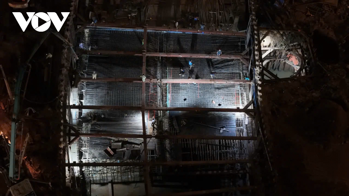 Những tia lửa hàn bắn ra như pháo hoa từ các lồng thép vách hầm. Công nhân đang chạy đua để hoàn thành khung cốt thép, chuẩn bị cho mẻ đổ bê tông quan trọng vào rạng sáng. (Ảnh: Thương Thanh)