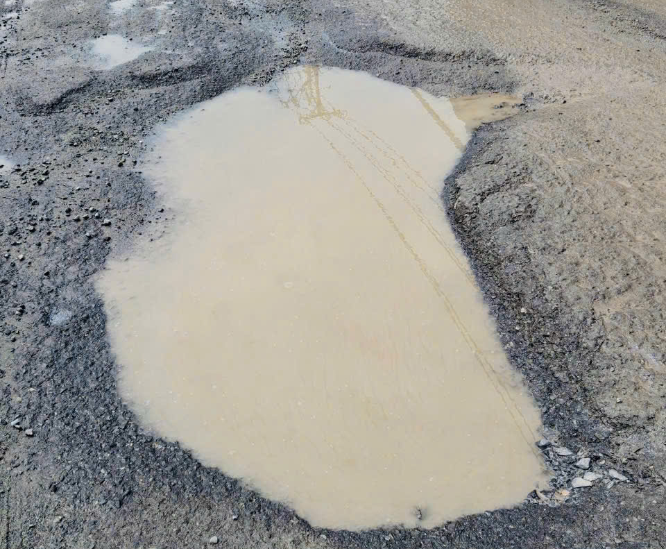 Hình ảnh tuyến đường khi thủy triều dâng che khuất các khu vực lồi lõm, ổ voi ổ gà gây nguy hiểm cho người dân.