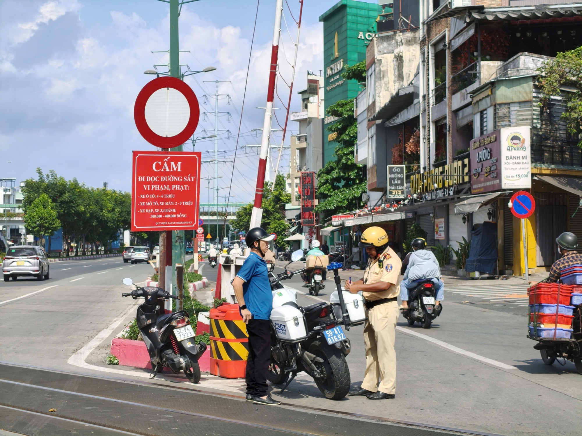 CSGT xử lí người tham gia giao thông vi phạm an toàn đường sắt.