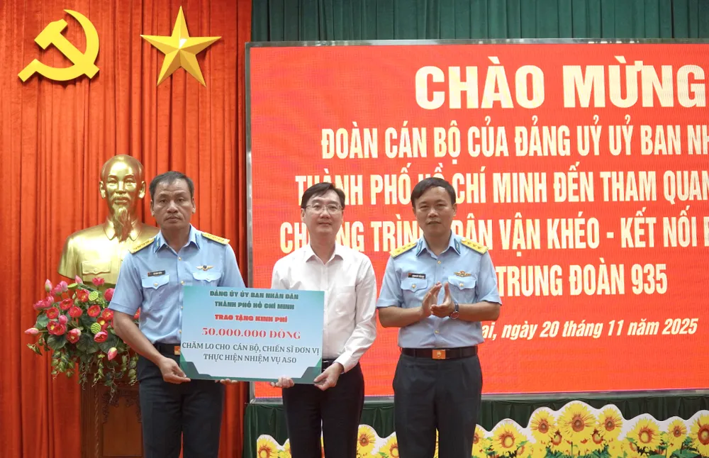 Ngày 20-11, tại Sân bay Biên Hòa, đoàn công tác của Đảng ủy UBND TP.HCM đến giao lưu chương trình “Dân vận khéo - Kết nối biên cương” với Trung đoàn 935 (Sư đoàn 370, Quân chủng Phòng không - Không quân).