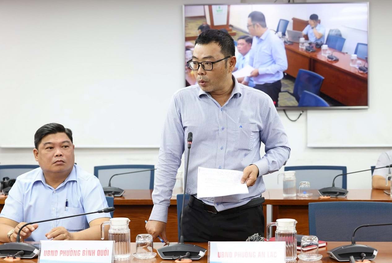 Phó Chủ tịch UBND phường An Lạc Lê Minh Nhựt trả lời báo chí về vấn đề sụt lún trên địa bàn. Ảnh: Trung tâm Báo chí Thành phố