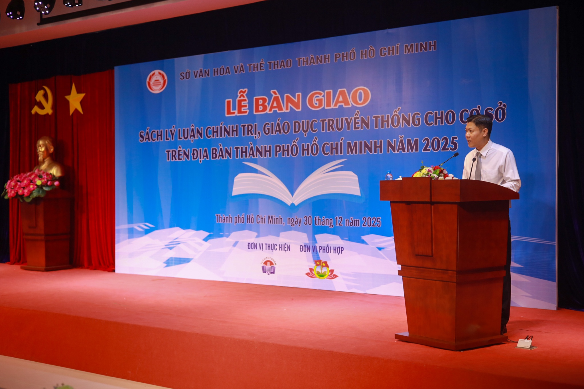 Phát biểu tại buổi lễ, ông Cao Văn Chóng, Phó bí thư Đảng ủy - Phó giám đốc Sở Văn hóa và Thể thao TP.HCM, cho biết tổng cộng 10.602 bản sách thuộc tủ sách "Bảo vệ nền tảng tư tưởng của Đảng" đã được tuyển chọn kỹ lưỡng và bàn giao cho 38 xã, phường. Mỗi đơn vị nhận 279 bản sách cùng tài khoản tra cứu văn bản pháp luật, nhằm hỗ trợ công tác tuyên truyền, giáo dục, tra cứu chuyên môn.