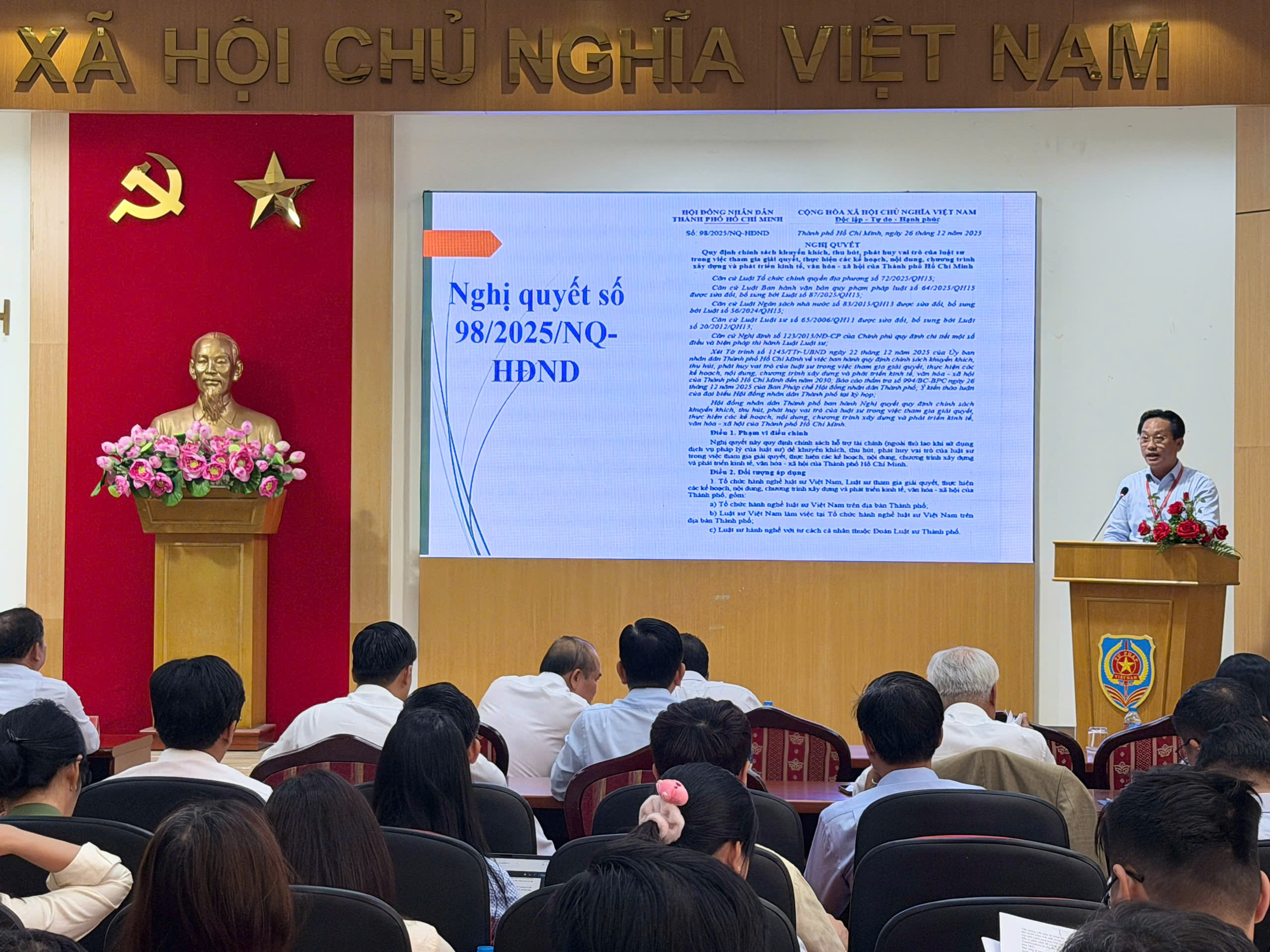Nghị quyết 98 được HĐND TP.HCM thông qua ngày 26-12-2025, quy định chính sách khuyến khích, thu hút và phát huy vai trò của luật sư trong tham gia xây dựng và triển khai các chương trình, kế hoạch phát triển kinh tế - xã hội của thành phố.