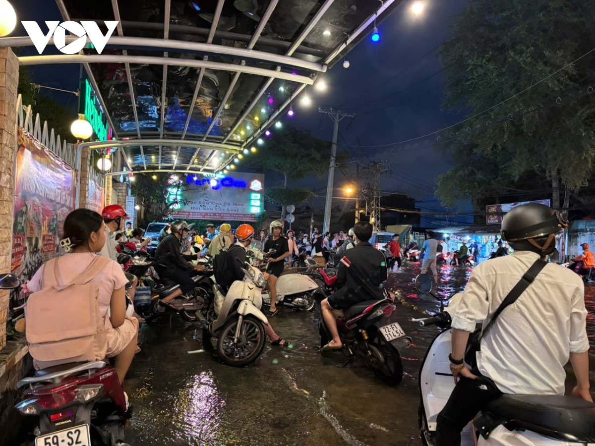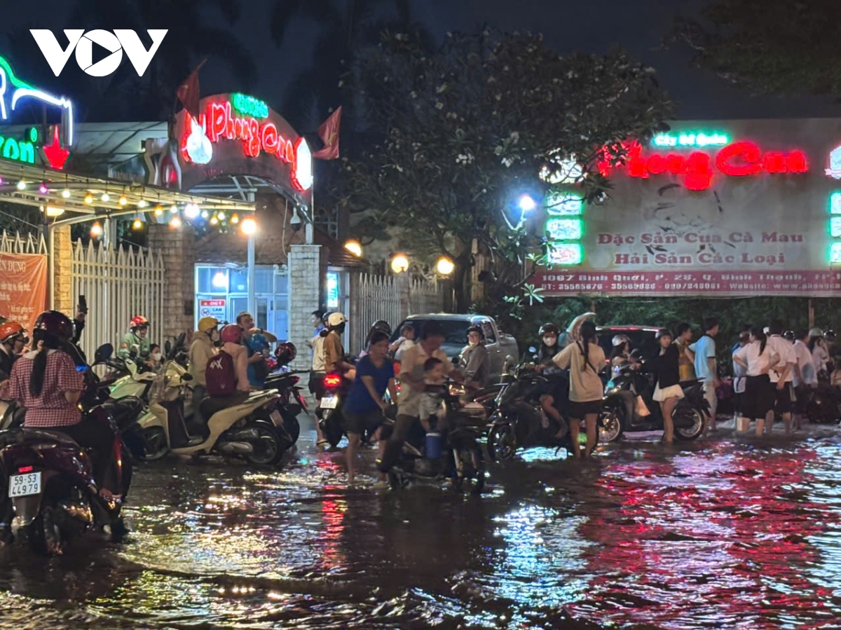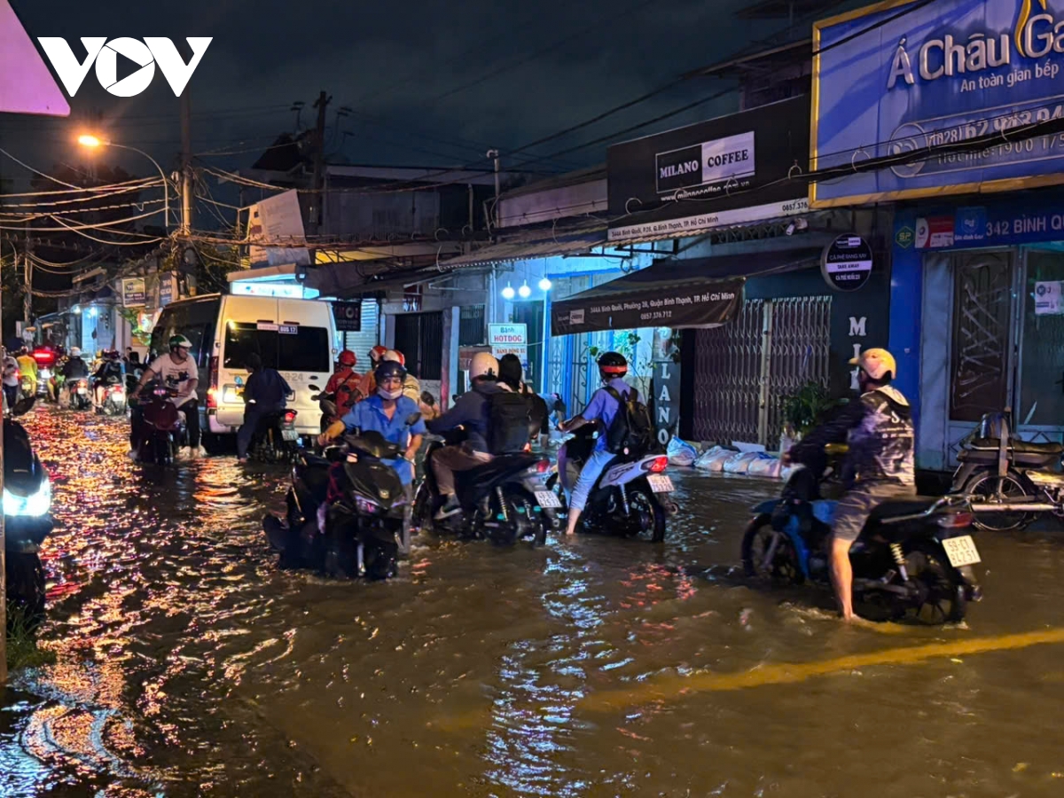 Từ khoảng 17h chiều, nhiều tuyến đường bắt đầu chìm trong biển nước. Tại đường Trần Xuân Soạn (phường Tân Hưng), nước dâng từ 30 đến 50 cm, khiến phương tiện di chuyển khó khăn, nhiều xe chết máy phải dắt bộ qua đoạn ngập. Một số hộ dân phải dựng tôn chắn, chặn bao cát để ngăn nước tràn vào nhà.