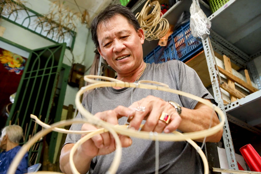 Ông Chiến đang tạo khung cho những chiếc lồng đèn. Ảnh: NGUYỆT NHI