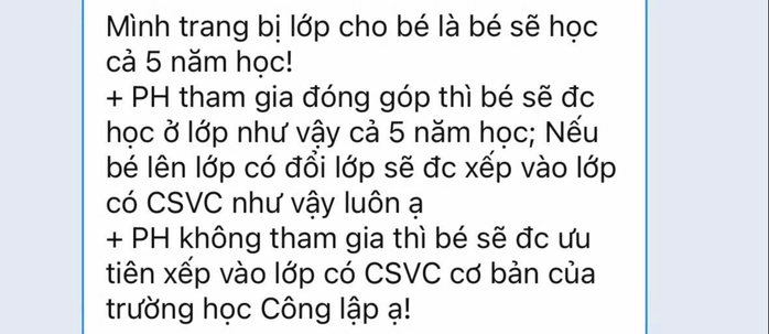 Chưa kể, một số phụ huynh còn nhận được tin nhắn của giáo viên: "Mình trang trí lớp cho bé là bé sẽ học cả 5 năm. Phụ huynh tham gia đóng góp thì bé sẽ được học ở lớp như vậy cả 5 năm. Nếu bé lên lớp, có đổi lớp thì sẽ được xếp vào lớp có cơ sở vật chất như vậy luôn. Phụ huynh không tham gia thì bé sẽ được ưu tiên xếp vào lớp có cơ sở vật chất cơ bản của trường học công lập".