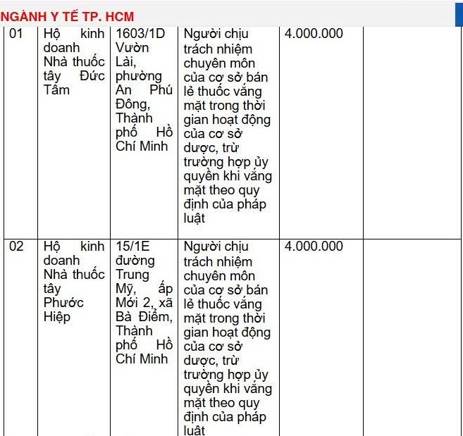 Hộ kinh doanh Nhà thuốc tây Đức Tâm (1603/1D Vườn Lài, phường An Phú Đông, Thành phố Hồ Chí Minh) và Hộ kinh doanh Nhà thuốc tây Phước Hiệp (15/1E đường Trung Mỹ, ấp Mới 2, xã Bà Điểm, TP HCM) đều bị xử phạt 4 triệu đồng.