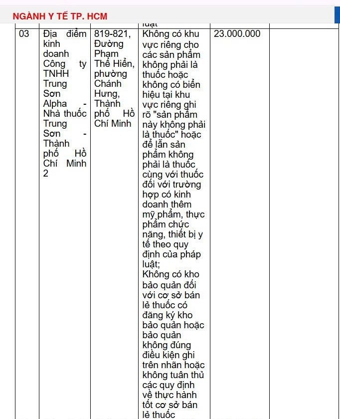 Địa điểm kinh doanh Công ty TNHH Trung Sơn Alpha - Nhà thuốc Trung Sơn - Thành phố Hồ Chí Minh 2 (819-821, đường Phạm Thế Hiển, phường Chánh Hưng, TP HCM) bị xử phạt 23 triệu đồng. Do không có khu vực riêng cho các sản phẩm không phải là thuốc hoặc không có biển hiệu tại khu vực riêng ghi rõ "sản phẩm này không phải là thuốc" hoặc để lẫn sản phẩm không phải là thuốc cùng với thuốc đối với trường hợp có kinh doanh thêm mỹ phẩm, thực phẩm chức năng, thiết bị y tế theo quy định của pháp luật; Không có kho bảo quản đối với cơ sở bán lẻ thuốc có đăng ký kho bảo quản hoặc bảo quản không đúng điều kiện ghi trên nhãn hoặc không tuân thủ các quy định về thực hành tốt cơ sở bán lẻ thuốc.