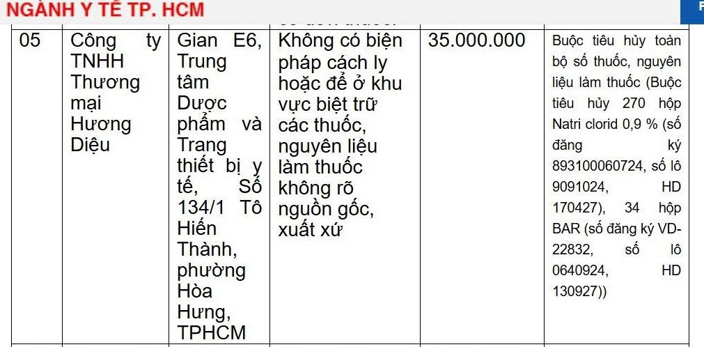 Với sai phạm trên, Công ty TNHH Thương mại Hương Diệu Sở Y tế TP HCM bị xử phạt hành chính số tiền 35 triệu đồng; Ngoài phạt tiền, còn buộc tiêu hủy toàn bộ số thuốc, nguyên liệu làm thuốc (buộc tiêu hủy 270 hộp Natri clorid 0,9 %, số đăng ký 893100060724, số lô 9091024, HD 170427 và 34 hộp BAR, số đăng ký VD-22832, số lô 0640924, HD 130927).