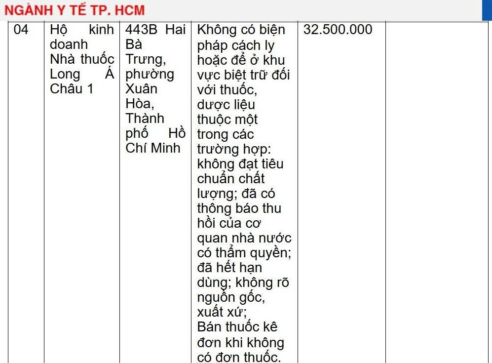 Trong danh sách các cơ sở vi phạm từ ngày 1/11- 15/11 trong lĩnh vực dược-mỹ phẩm do Sở Y tế TP HCM vừa công bố còn có Hộ kinh doanh Nhà thuốc Long Á Châu 1 (443B Hai Bà Trưng, phường Xuân Hòa, TP HCM) bị xử phạt 32,5 triệu đồng.