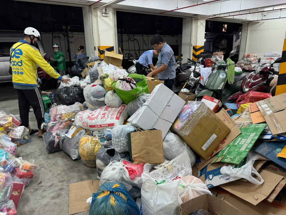 Hàng trăm thùng hàng, quần áo, nhu yếu phẩm được người dân gom góp gửi tại Ủy ban MTTQ Việt Nam TP.HCM để hỗ trợ bà con vùng lũ. Ảnh: BẢO PHƯƠNG