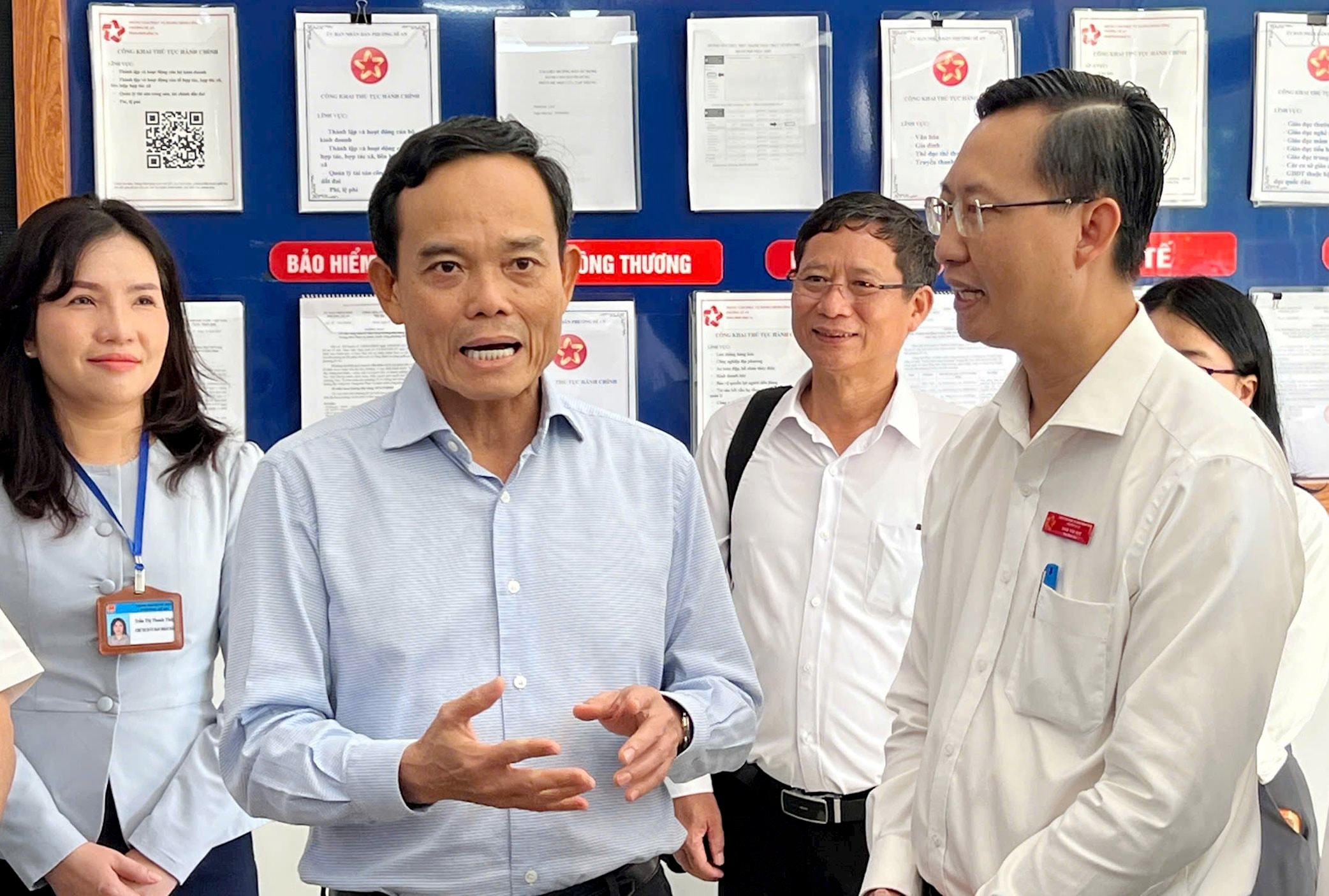 Trước buổi làm việc, Bí thư Thành ủy Trần Lưu Quang cùng đoàn công tác khảo sát tình hình hoạt động của Trung tâm Phục vụ hành chính công (TTPVHCC) phường Dĩ An.