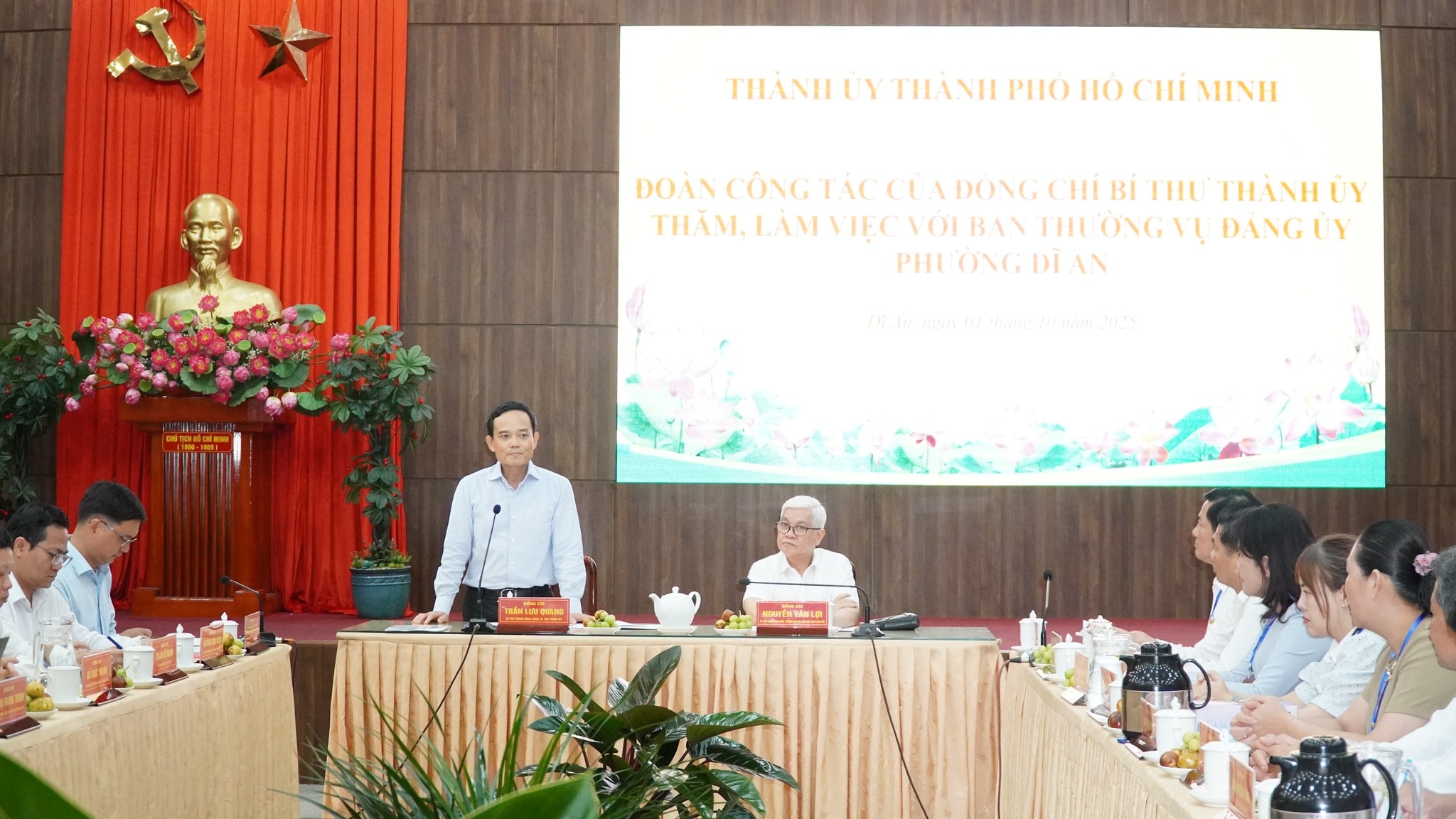 Ngày 1/10, đoàn công tác của Thành ủy TP. Hồ Chí Minh do Bí thư Trung ương Đảng, Bí thư Thành ủy TP. Hồ Chí Minh Trần Lưu Quang làm trưởng đoàn đã có buổi thăm, làm việc với Đảng ủy phường Dĩ An.
