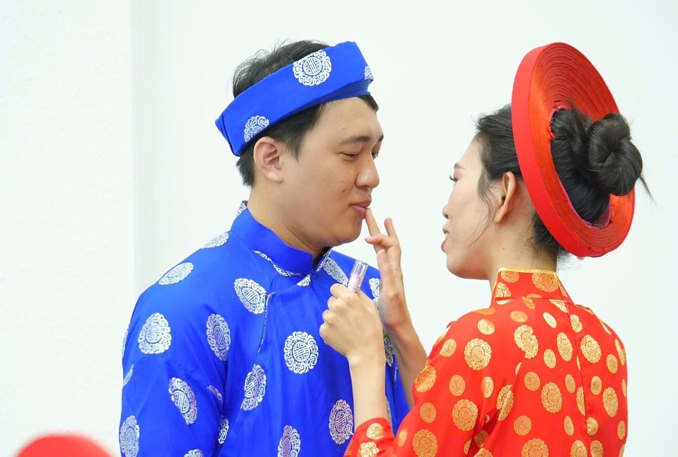 Cô dâu sửa soạn trang điểm cho chú rể trước khi bước vào đại lễ. Ảnh: Nhóm YEAC.
