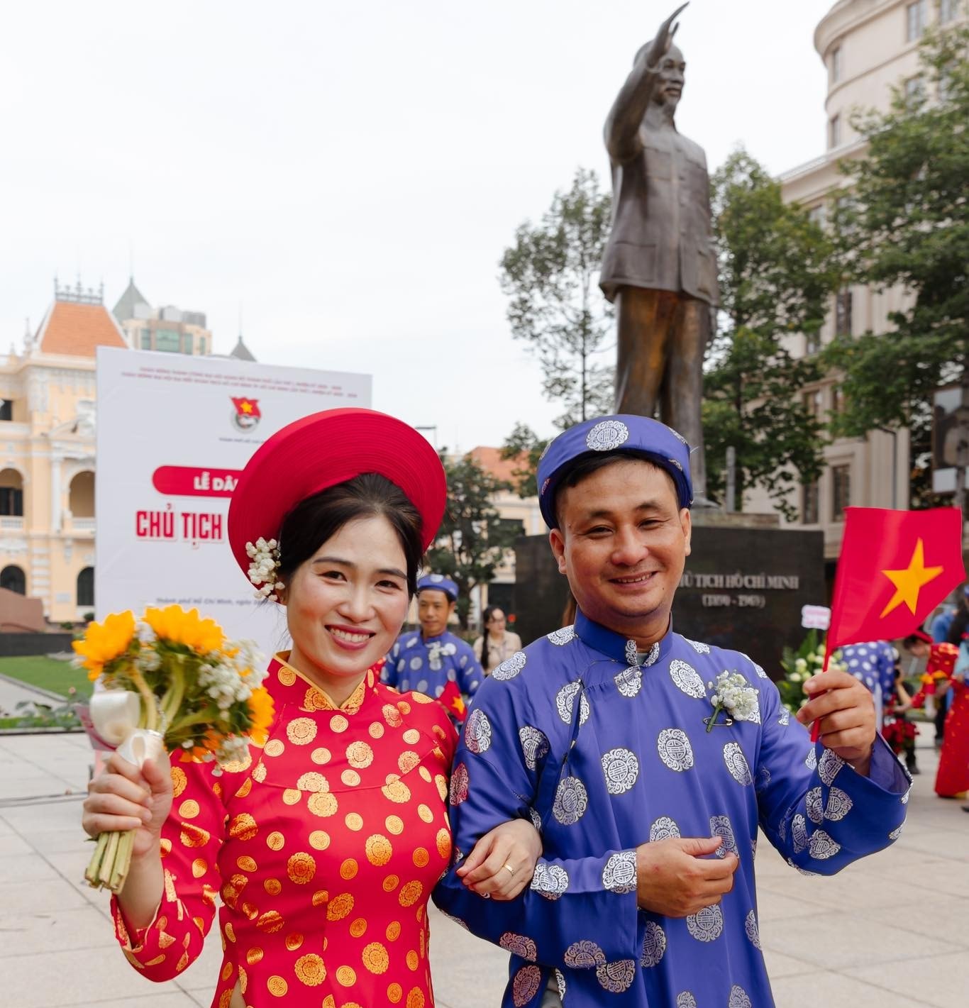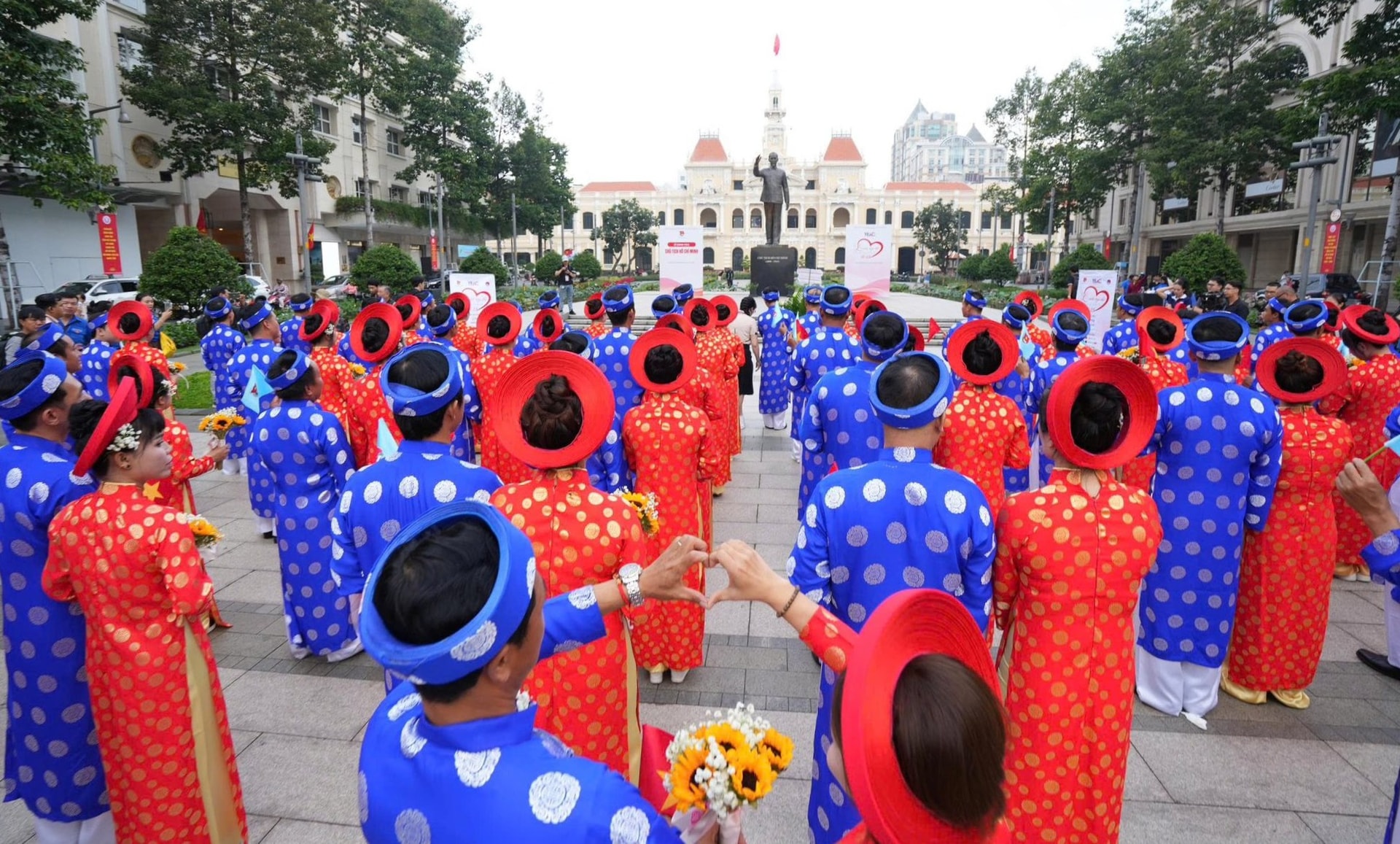 50 cặp đôi tham gia Lễ cưới tập thể thanh niên công nhân thành phố Hồ Chí Minh dâng hoa trước Tượng đài Chủ tịch Hồ Chí Minh. Ảnh: Nhóm YEAC.