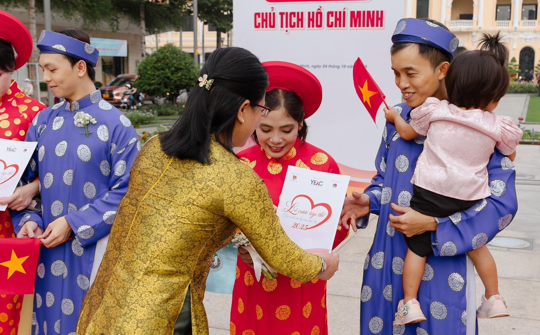 Các đồng chí lãnh đạo thành phố Hồ Chí Minh trao giấy chứng nhận kết hôn và chúc mừng các cặp đôi. Ảnh: Nhóm YEAC.