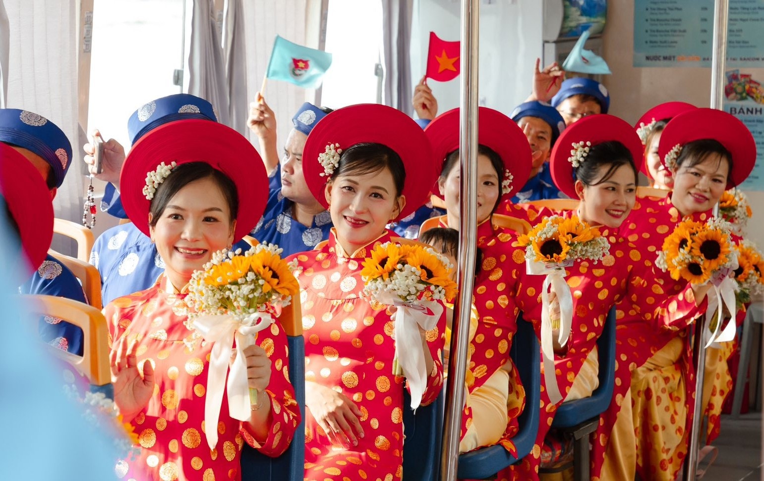 Các cặp đôi lên xe buýt đường thủy di chuyển đến trung tâm tiệc cưới. Ảnh: Nhóm YEAC.