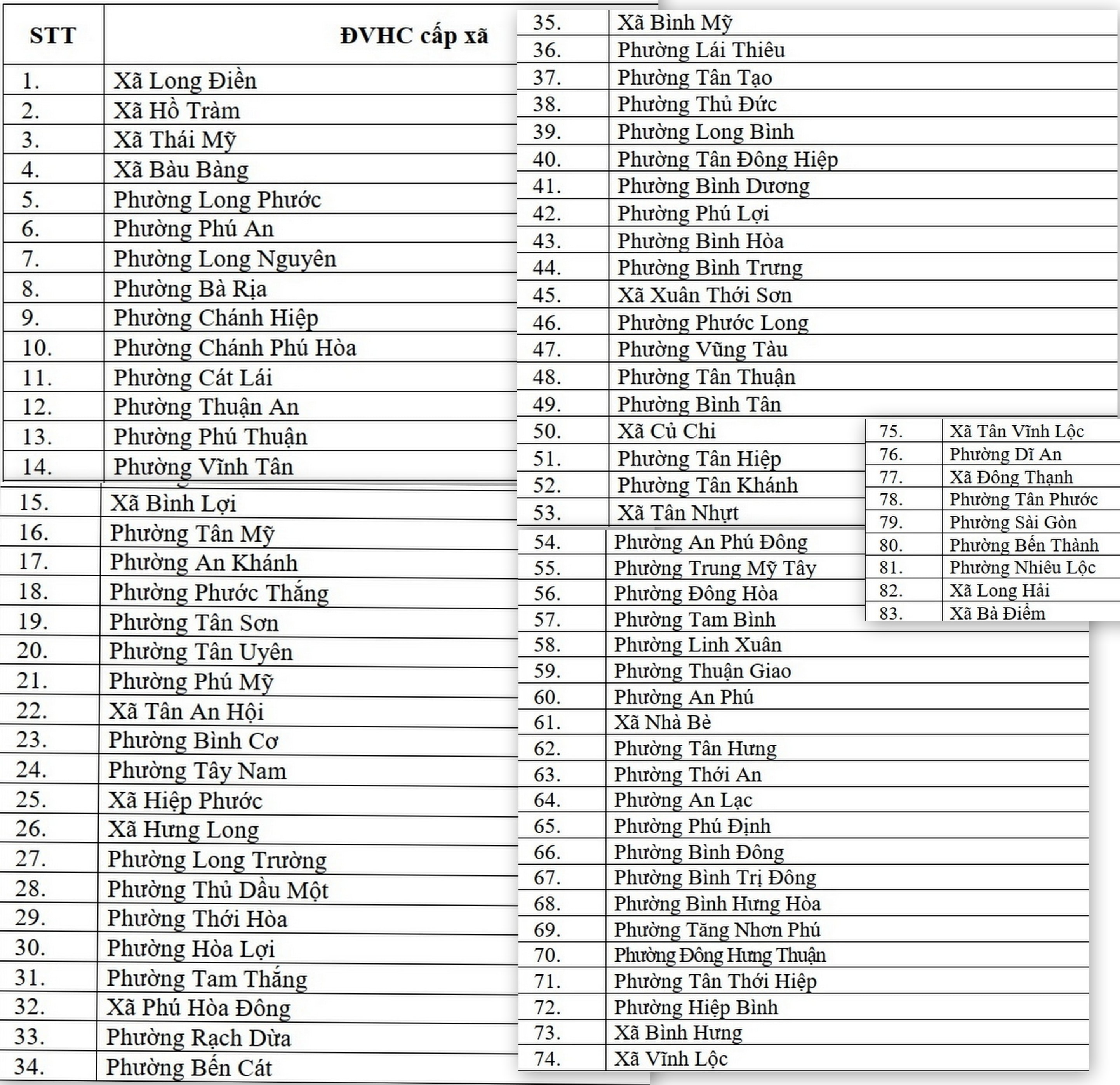 Theo đó, căn cứ Kết luận số 187-KL/TW của Bộ Chính trị, Điều 6 Nghị định số 300/2025/NĐ-CP của Chính phủ và mục 1 Kết luận số 235-KL/TU của Ban Thường vụ Thành ủy, TP. Hồ Chí Minh có 83 đơn vị hành chính (ĐVHC) cấp xã đủ điều kiện, tiêu chí về quy mô dân số (từ 50.000 người trở lên), diện tích tự nhiên (trên 5,5km2 đối với phường, trên 30km2 đối với xã) hoặc là địa phương trọng điểm, phức tạp về trật tự, an toàn xã hội được bố trí tăng thêm 1 phó chủ tịch UBND. Các địa phương này sẽ có tổng cộng 3 Phó Chủ tịch UBND.