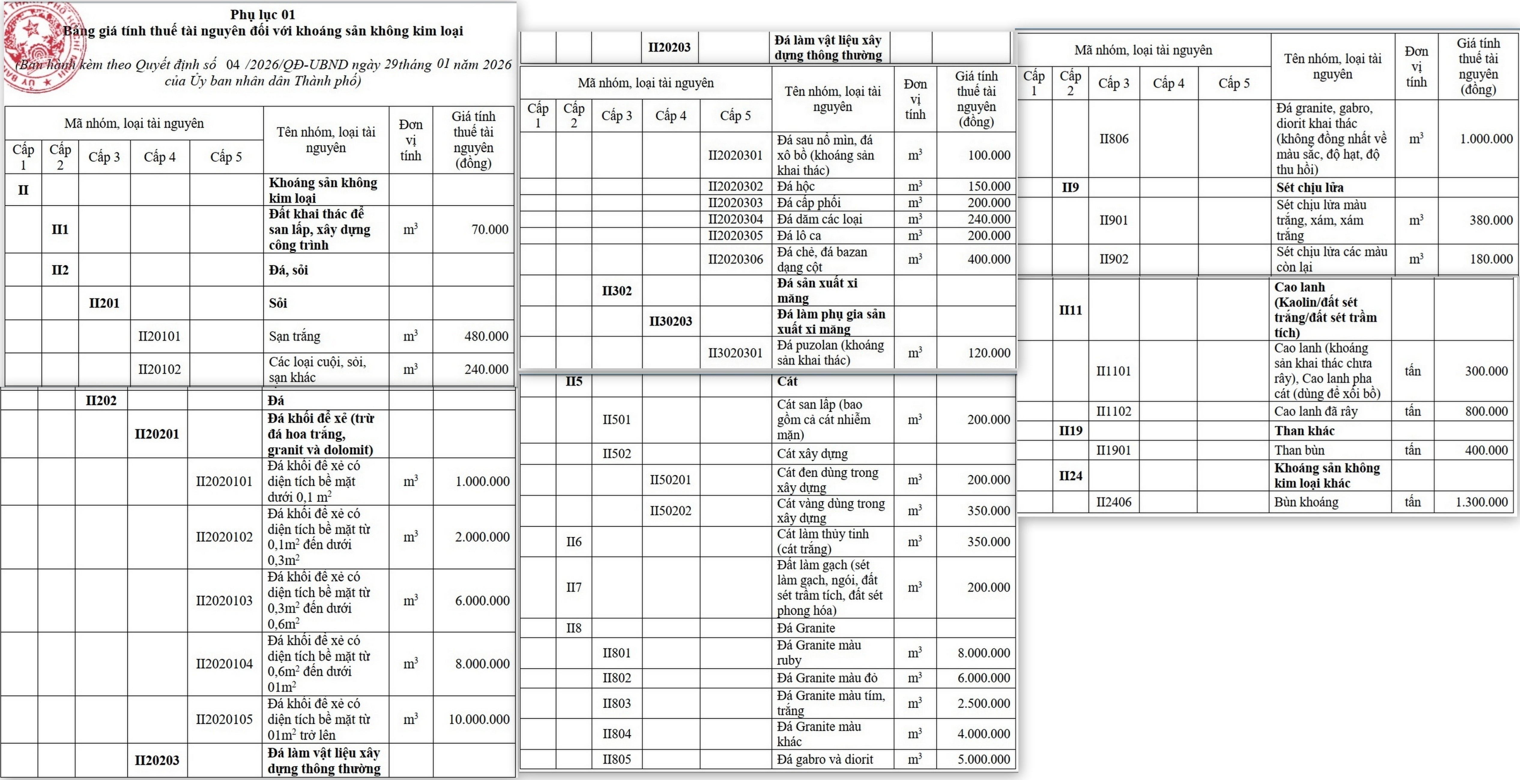 Bảng giá tính thuế TN đối với khoáng sản không kim loại. Ảnh: Quang Phương