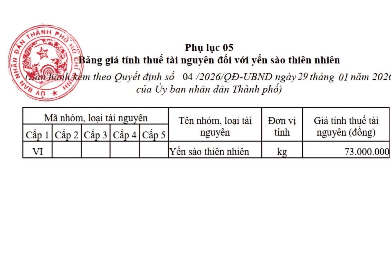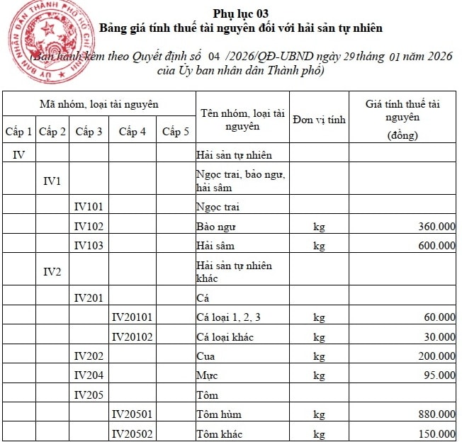 Ngày 29/1, UBND TP. Hồ Chí Minh ban hành Quyết định số 04/2026/QĐ-UBND về ban hành Bảng giá tính thuế tài nguyên (TN) trên địa bàn thành phố.