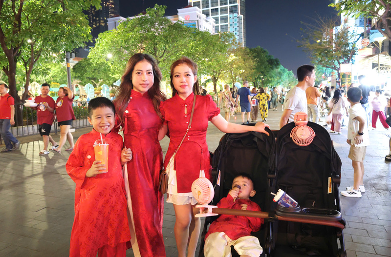 Gia đình chị Trần Thị Mỹ Linh diện trang phục áo dài truyền thống, tham quan các tiểu cảnh tại trung tâm TP. Hồ Chí Minh. Ảnh: Minh Anh