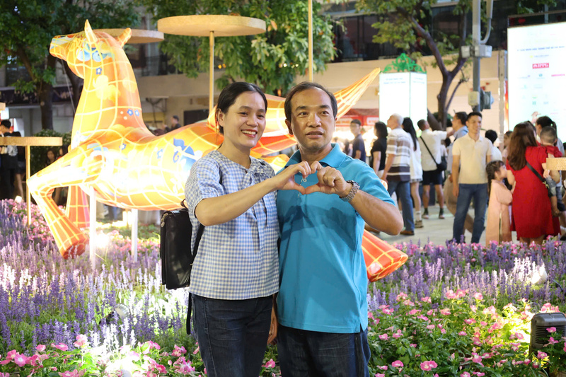 Hai bạn trẻ tranh thủ ghi lại những khoảnh khắc rạng rỡ bên các tiểu cảnh hoa rực rỡ trước thời khắc giao thừa. Ảnh: Minh Anh