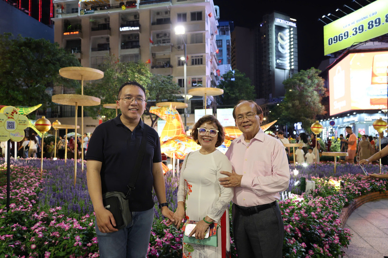 Cô Lê Thị Minh Lý cùng gia đình rạng rỡ tham quan và chụp ảnh lưu niệm tại Đường hoa Nguyễn Huệ trong thời khắc đợi chờ giao thừa Bính Ngọ 2026. Ảnh: Minh Anh