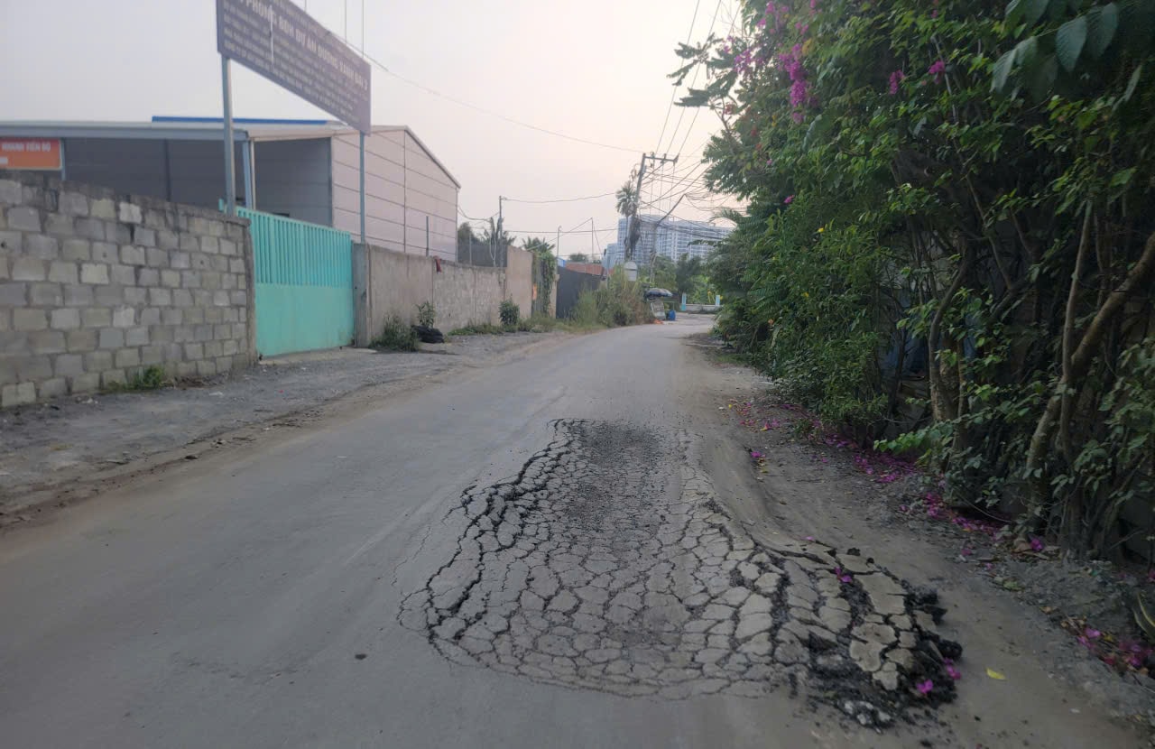 Một số đoạn mặt đường đường Trường Lưu bị bể nát, gây mất an toàn giao thông. Ảnh: Quang Phương chụp sáng 19/4