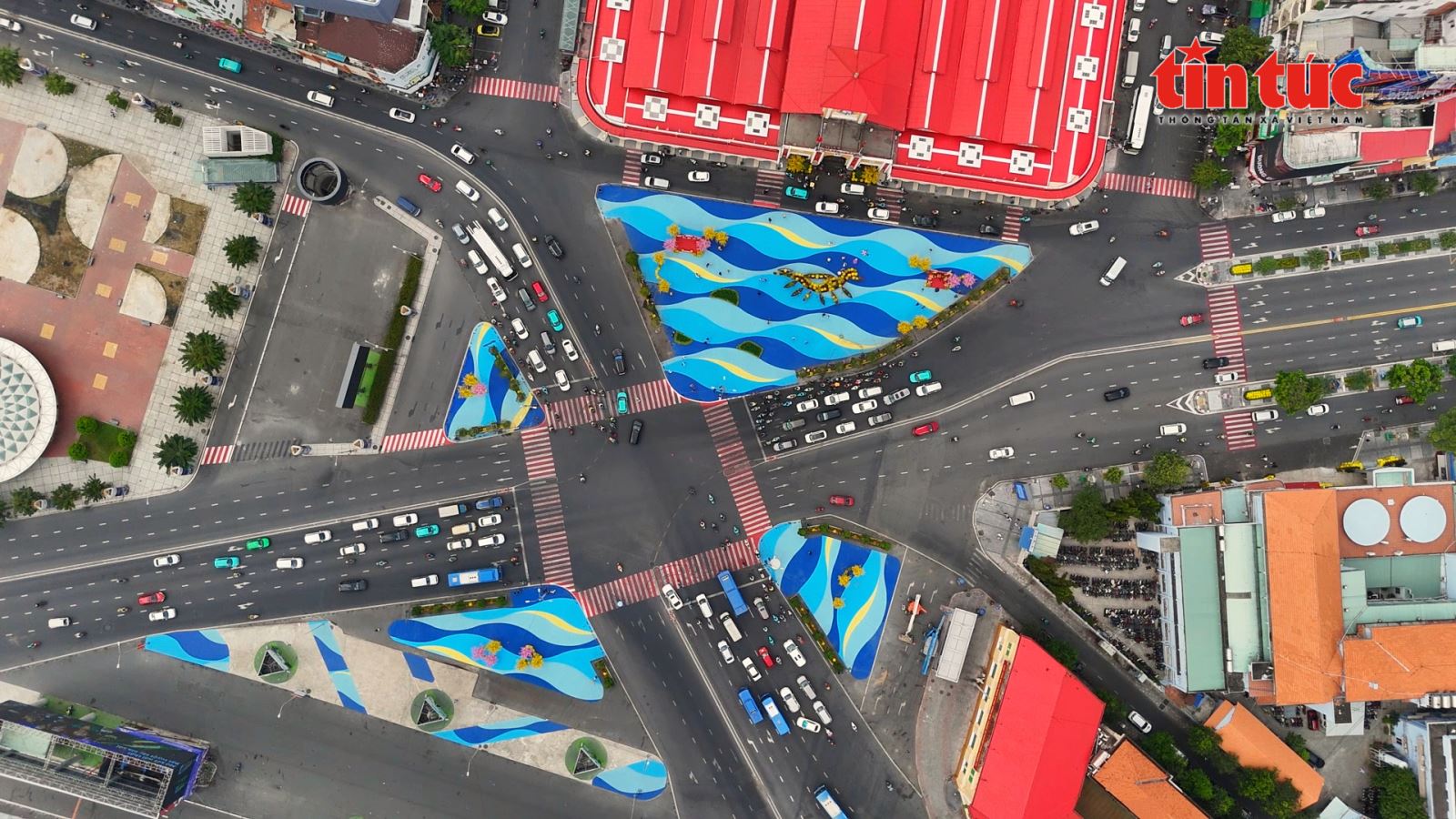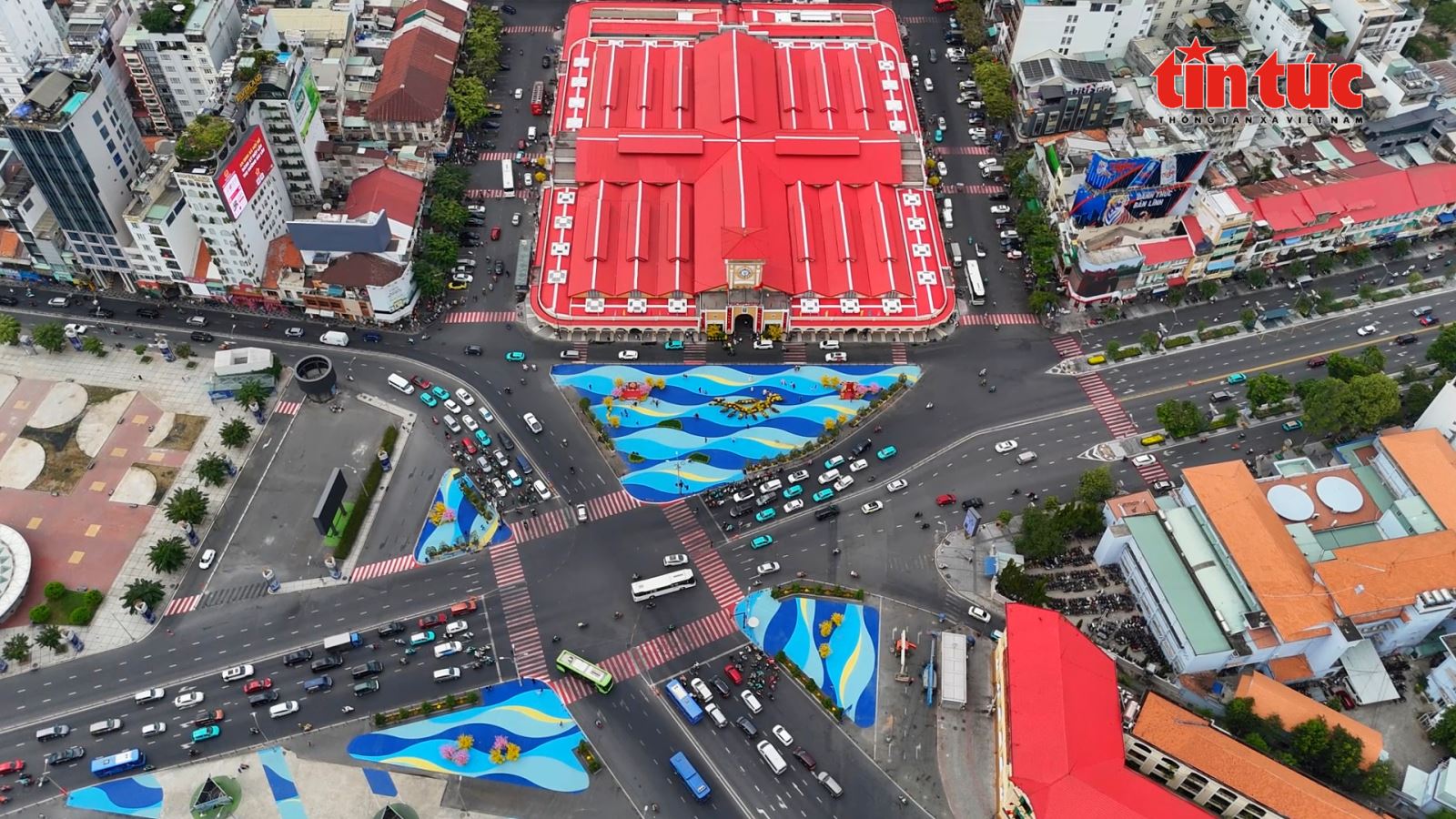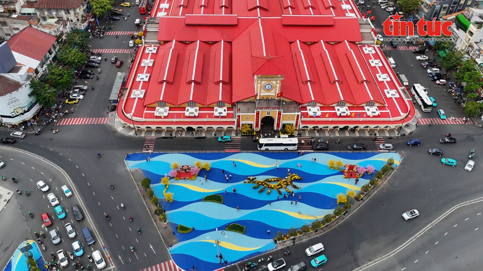 Quảng trường trước chợ Bến Thành được sơn họa tiết sóng nước lấy cảm hứng từ văn hóa Nam Bộ và kênh rạch xưa, tạo điểm nhấn cảnh quan gắn với dấu ấn lịch sử sông Bến Nghé.