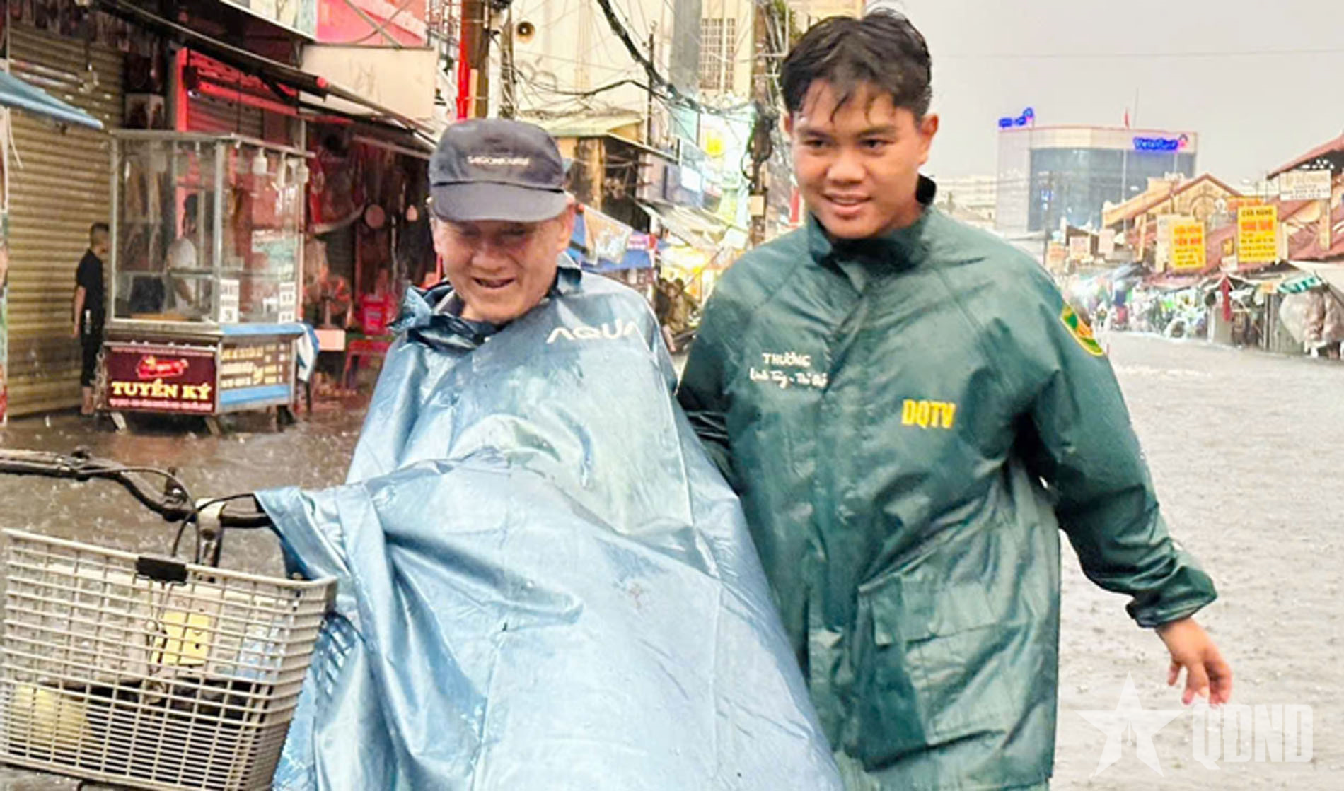 Dân quân phường Thủ Đức, TP Hồ Chí Minh đưa người già qua đoạn đường ngập do mưa lớn.