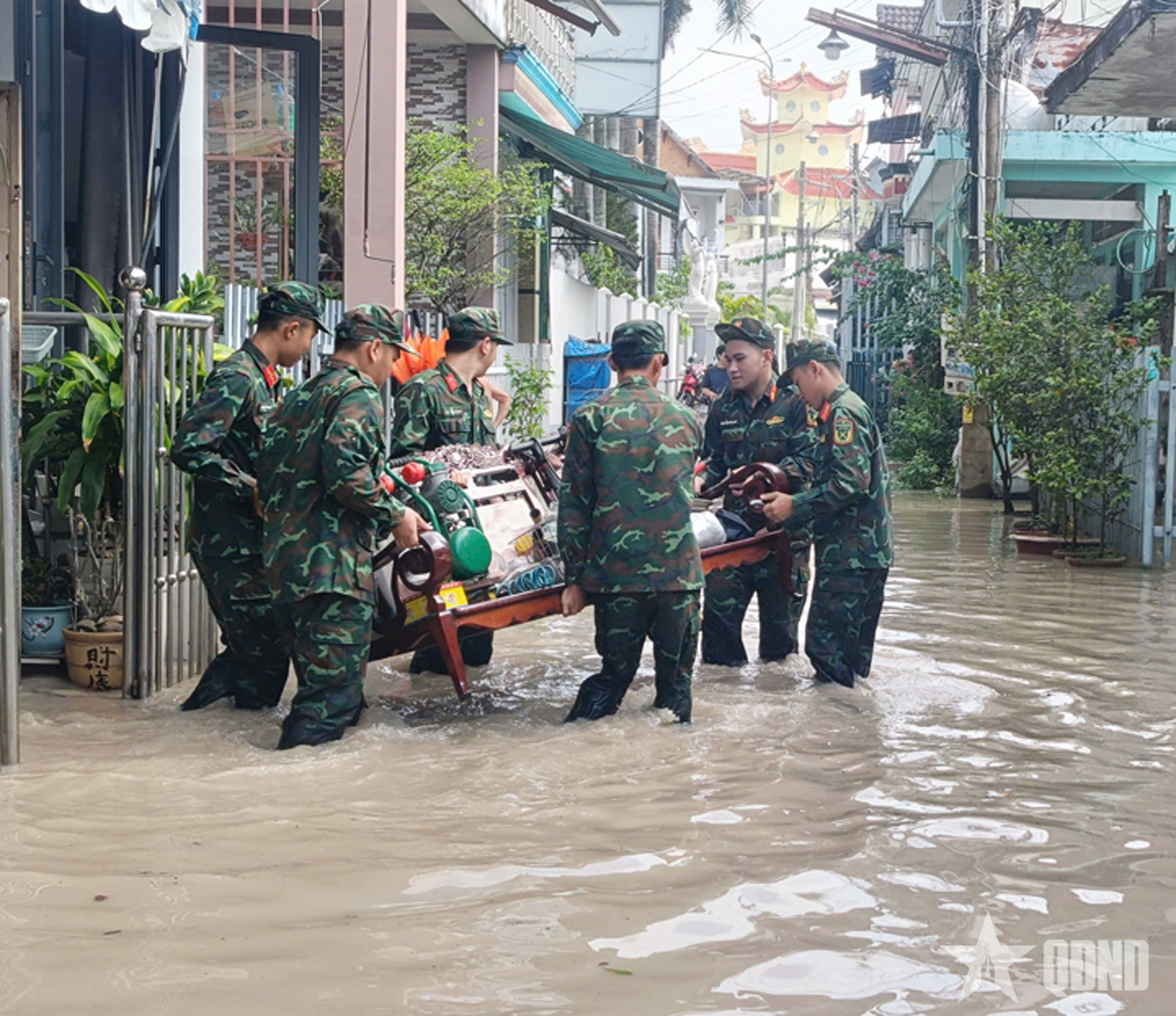 Cán bộ, chiến sĩ TP Hồ Chí Minh giúp dân chuyển tài sản do mưa lớn gây ngập.