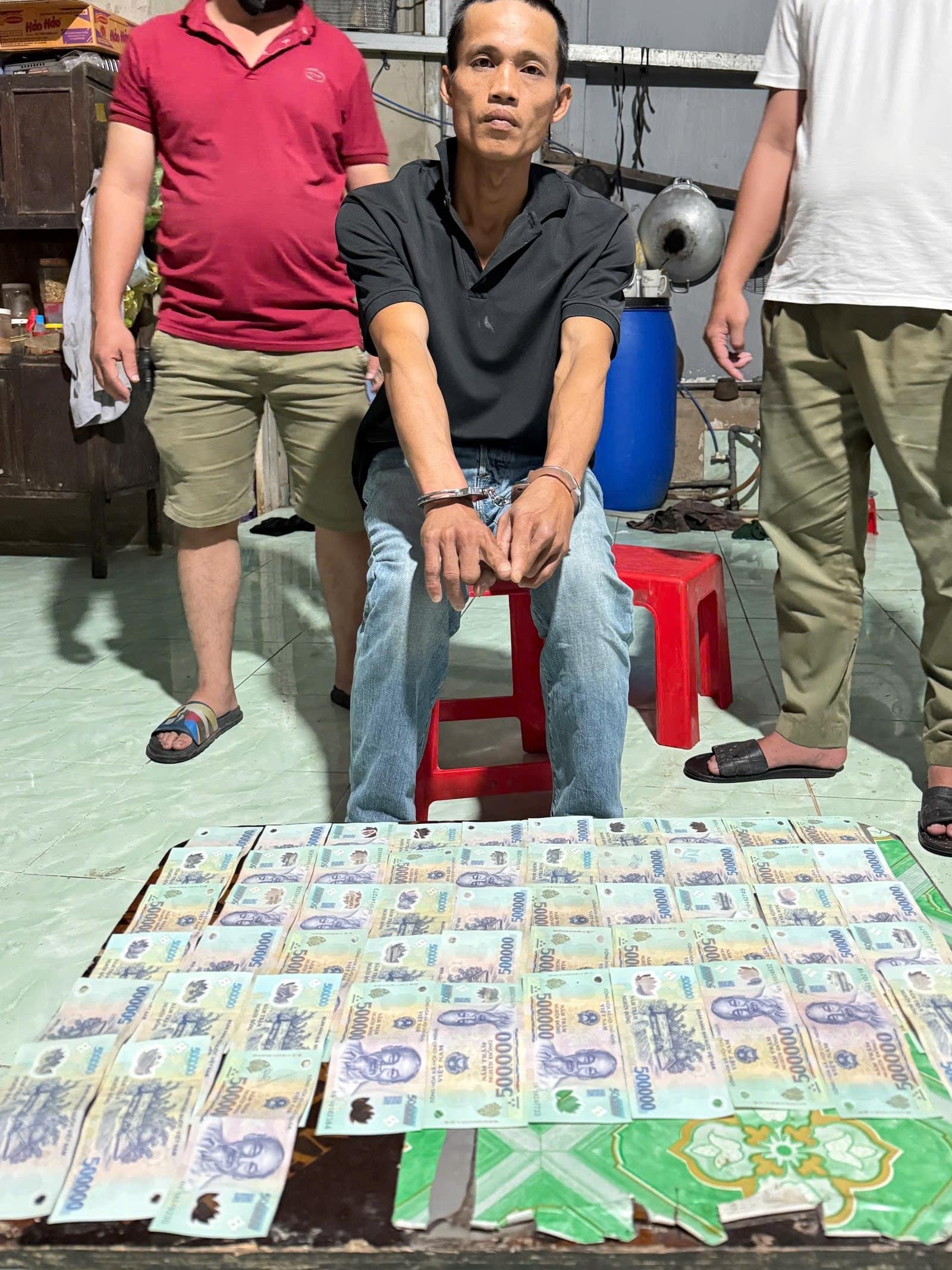 Nguyễn Thanh Hùng và số tiền mặt sau khi tẩu tán chiếc nhẫn vàng. Ảnh: Công an cung cấp.