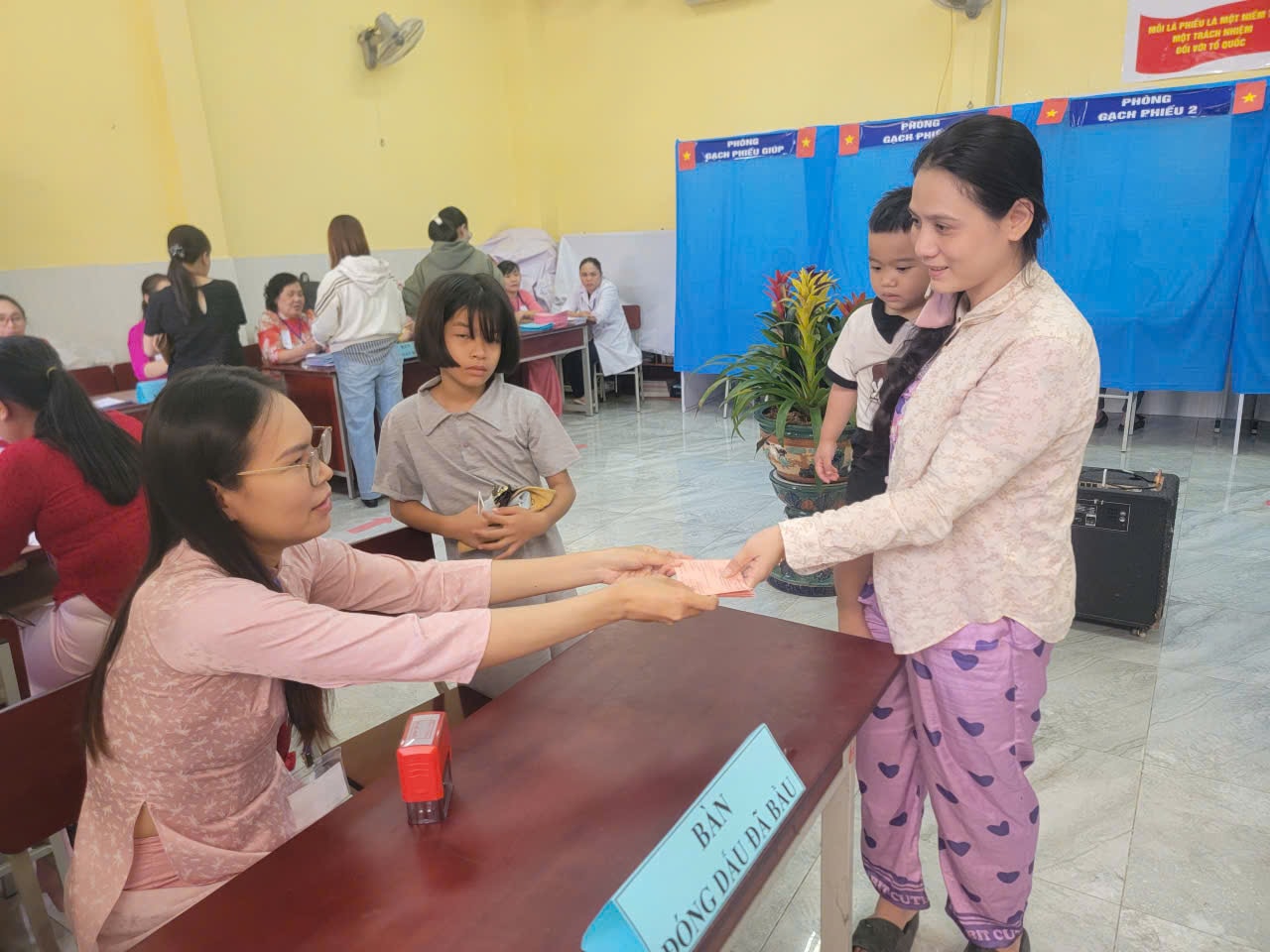 Lúc 10h, tại Khu vực bỏ phiếu bầu cử số 31, xã Bình Hưng (huyện Bình Chánh cũ), hòa trong dòng cử tri đi bỏ phiếu, nổi bật là hình ảnh người phụ nữ trẻ bồng theo con nhỏ trên tay. Chị là cử tri Huỳnh Mỹ Bích Vân (38 tuổi).