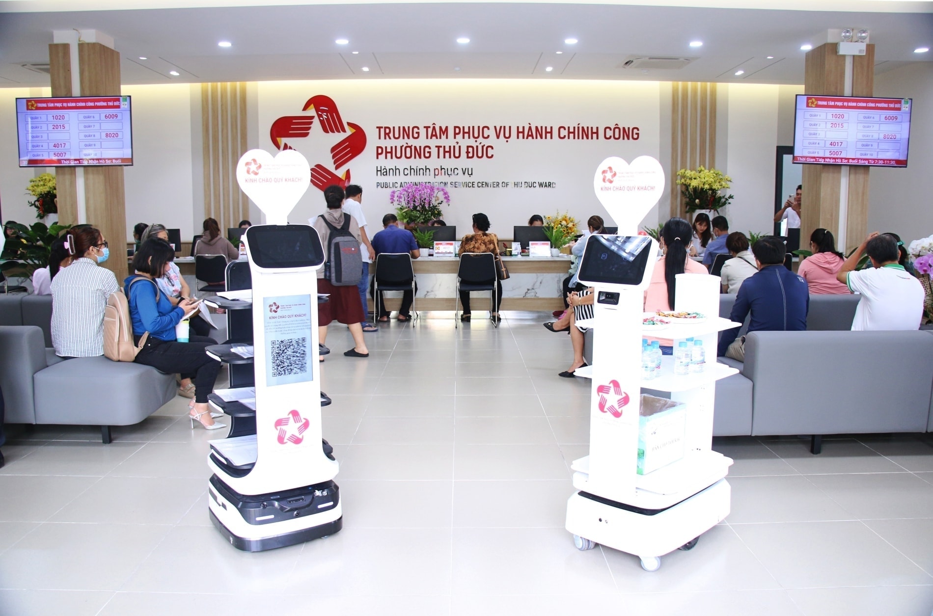 Mô hình chính quyền địa phương 2 cấp tại TP. Hồ Chí Minh đã và đang đẩy mạnh chuyển đổi số trong phục vụ người dân và doanh nghiệp. Trong ảnh là robot phục vụ tiếp công dân tại Trung tâm Phục vụ hành chính công phường Thủ Đức