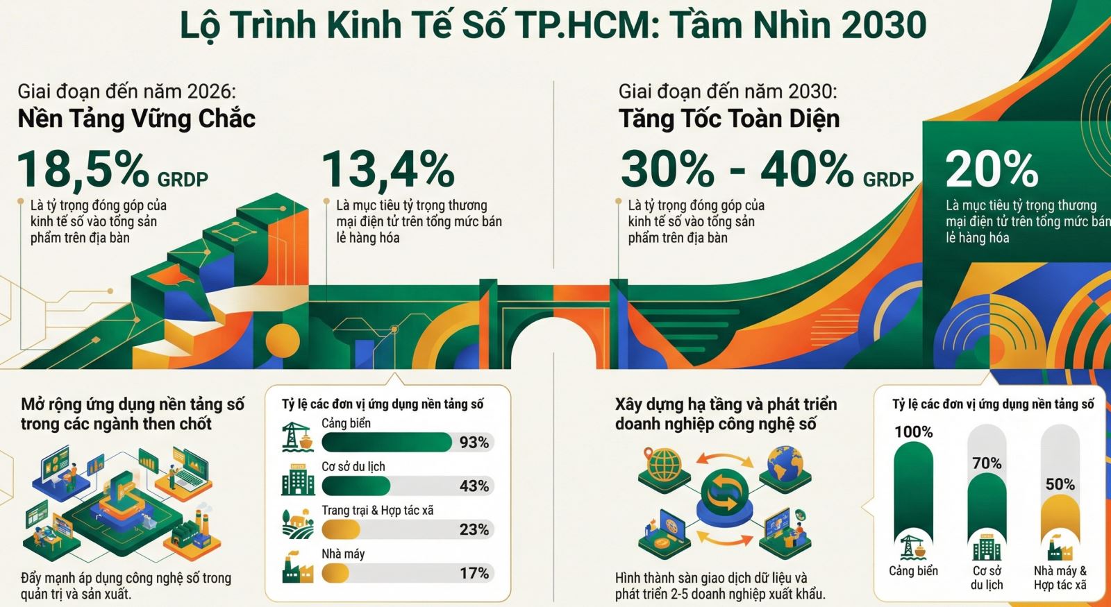 Chỉ tiêu cụ thể được TP Hồ Chí Minh đặt cho từng giai đoạn, gồm: Đến năm 2026, kinh tế số của TP Hồ Chí Minh dự kiến chiếm khoảng 18,5% GRDP; tỷ trọng kinh tế số trong từng ngành đạt tối thiểu 13,4%. Thương mại điện tử chiếm 13,4% tổng mức bán lẻ hàng hóa.