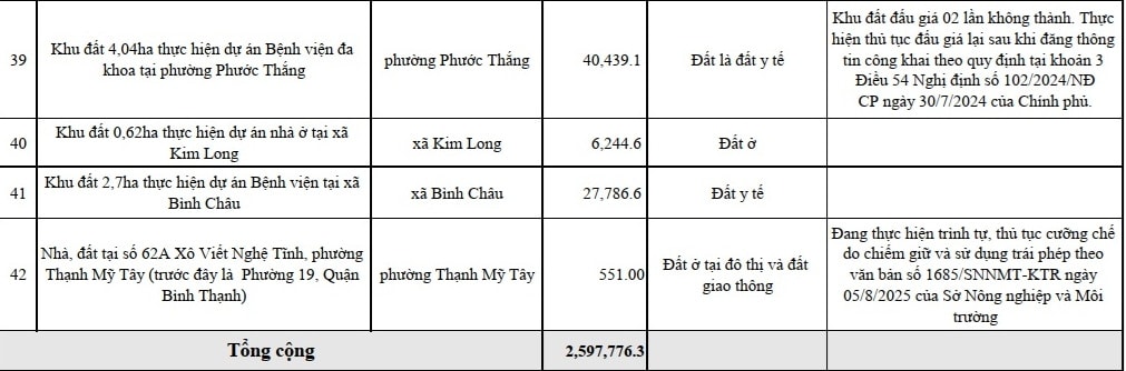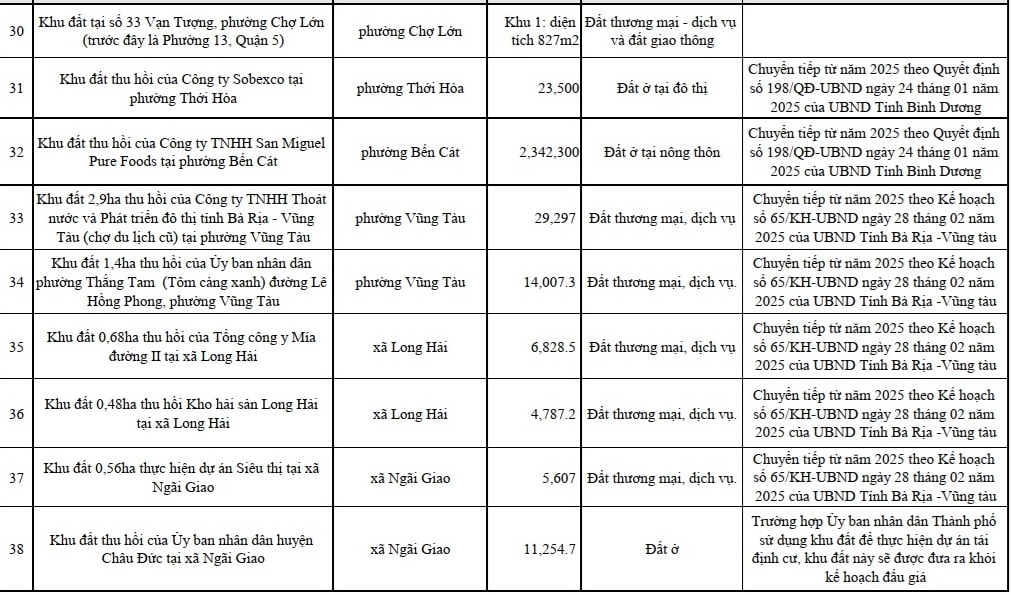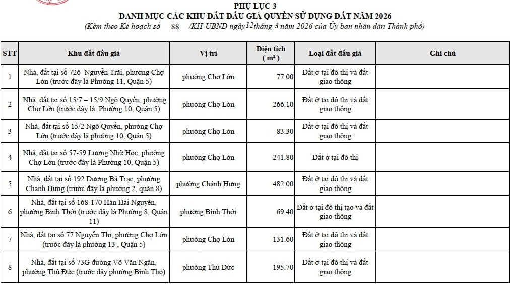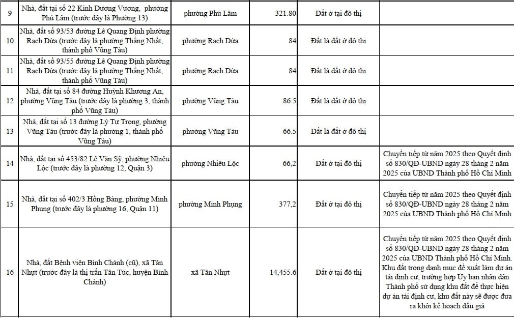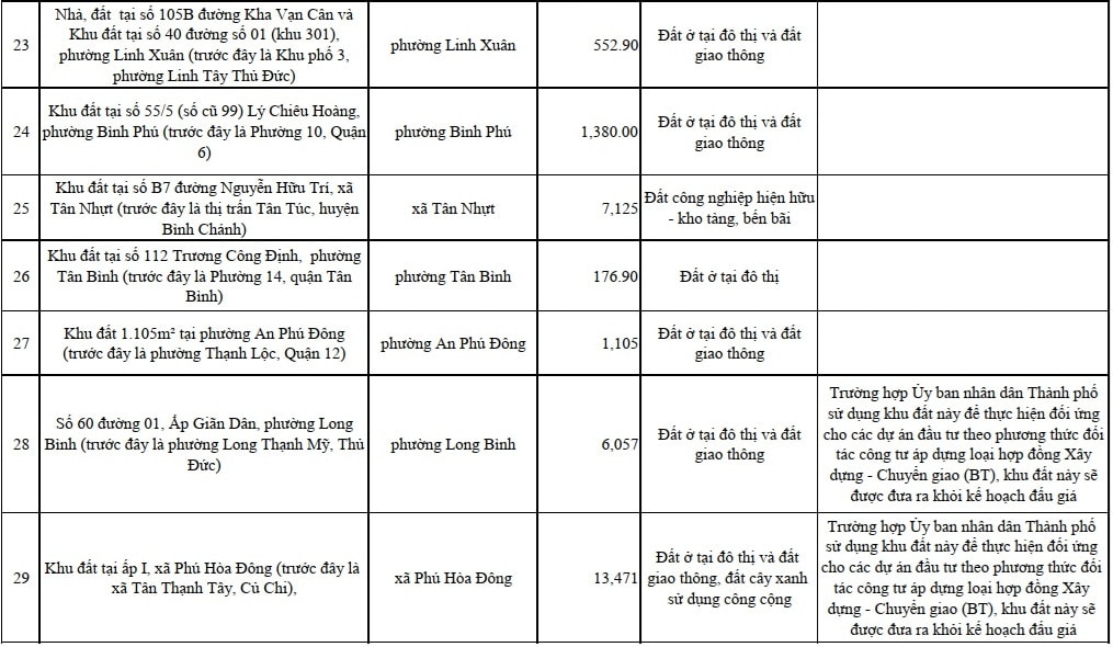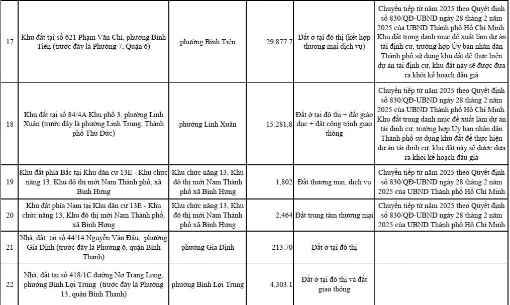 Bên cạnh đó, TP. Hồ Chí Minh cũng sẽ đấu giá quyền sử dụng 42 nhà, đất khác (tổng diện tích hơn 259ha). Các nhà, đất này có mục đích sử dụng đất chủ yếu là đất ở, đất thương mại, dịch vụ do Trung tâm PTQĐ TP. Hồ Chí Minh quản lý.