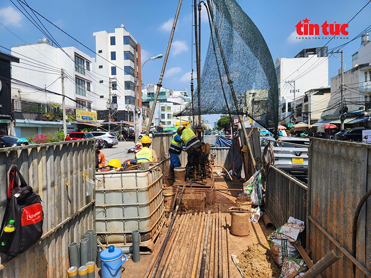 Tương tự, tại khu vực ga ngầm Bảy Hiền – nơi có mật độ phương tiện lưu thông cao, công tác khoan cũng được triển khai khẩn trương, kết hợp điều tiết giao thông. Anh Phạm Hoàng Phúc, phụ trách tổ khoan số 4 chia sẻ: “Tổ có 6 người vừa thi công vừa phối hợp điều tiết giao thông. Vị trí khoan giữa giao lộ Bảy Hiền có độ sâu thiết kế 106 m, hiện đã đạt gần 30 m. Do lưu lượng xe đông, chúng tôi tranh thủ thi công xuyên trưa, chỉ nghỉ khoảng 1 giờ để sớm hoàn thành, giảm ùn tắc. Dự kiến sẽ khoan xong vào cuối tuần này”.