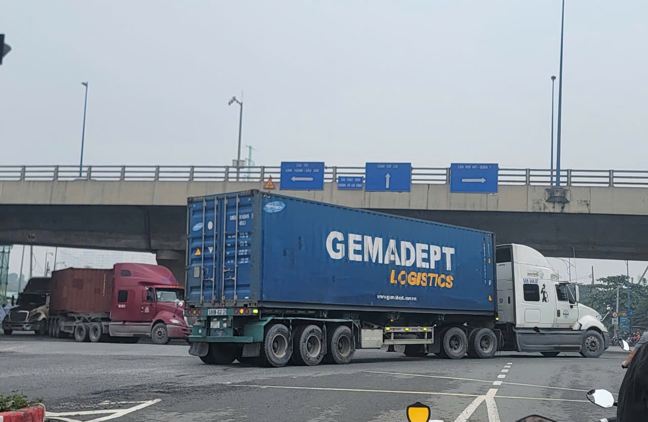 Các xe container hoạt động vận chuyển hàng hóa tại khu vực vòng xoay Mỹ Thủy. Ảnh: Quang Phương