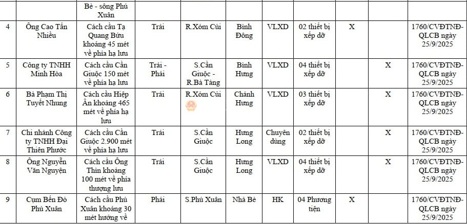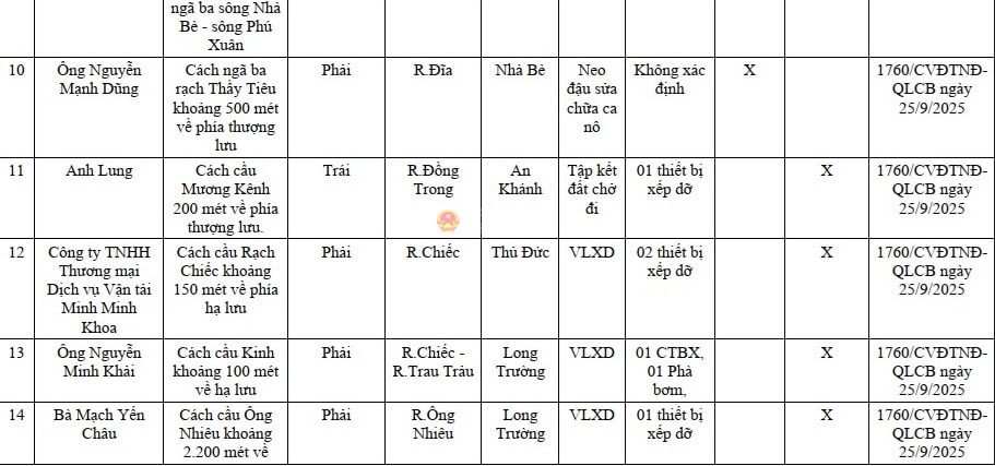 Theo danh sách, trên địa bàn TP. Hồ Chí Minh (cũ) có 50 vị trí chưa được công bố hoạt động bến thủy nội địa, khu neo đậu. Trong đó, có nhiều vị trí nằm trong phạm vi hành lang bảo vệ cầu, công trình vượt sông như: Bến đò Đoàn Thị Sáu (cách cầu Phú Xuân khoảng 30m hướng về ngã ba sông Nhà Bè – song Phú Xuân), bến ông Cao Tấn Nhiều (cách cầu Tạ Quang Bửu khoảng 45m về phía hạ lưu, phường Bình Đông), cụm bến đò Phú Xuân (cách cầu Phú Xuân khoảng 30m về hướng ngã ba sông Nhà Bè – song Phú Xuân, xã Nhà Bè).