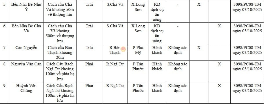 Trên địa bàn TP. Hồ Chí Minh (cũ) có 9 vị trí chưa được công bố hoạt động bến thủy nội địa, khu neo đậu. Trong đó, có 2 nhiều vị trí nằm trong phạm vi hành lang bảo vệ cầu, công trình vượt sông: Bến Nhà Bè Như Ý (cách cầu Chà Và khoảng 50m về thượng lưu, xã Long Sơn) và bến Cao Nguyễn (cách cầu Bàn Thạch khoảng 20m, phường Phú Mỹ).