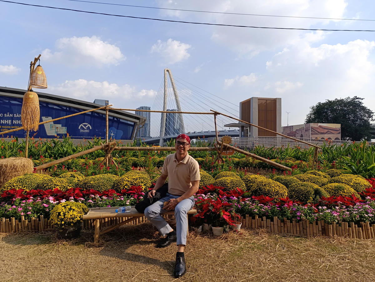 Khu vực cảnh quan vườn hoa Tết cạnh ga Ba Son (tuyến Metro số 1) thu hút nhiều bạn trẻ đến chụp hình, check-in dịp Tết 2026. Ảnh: Hồng Phúc.