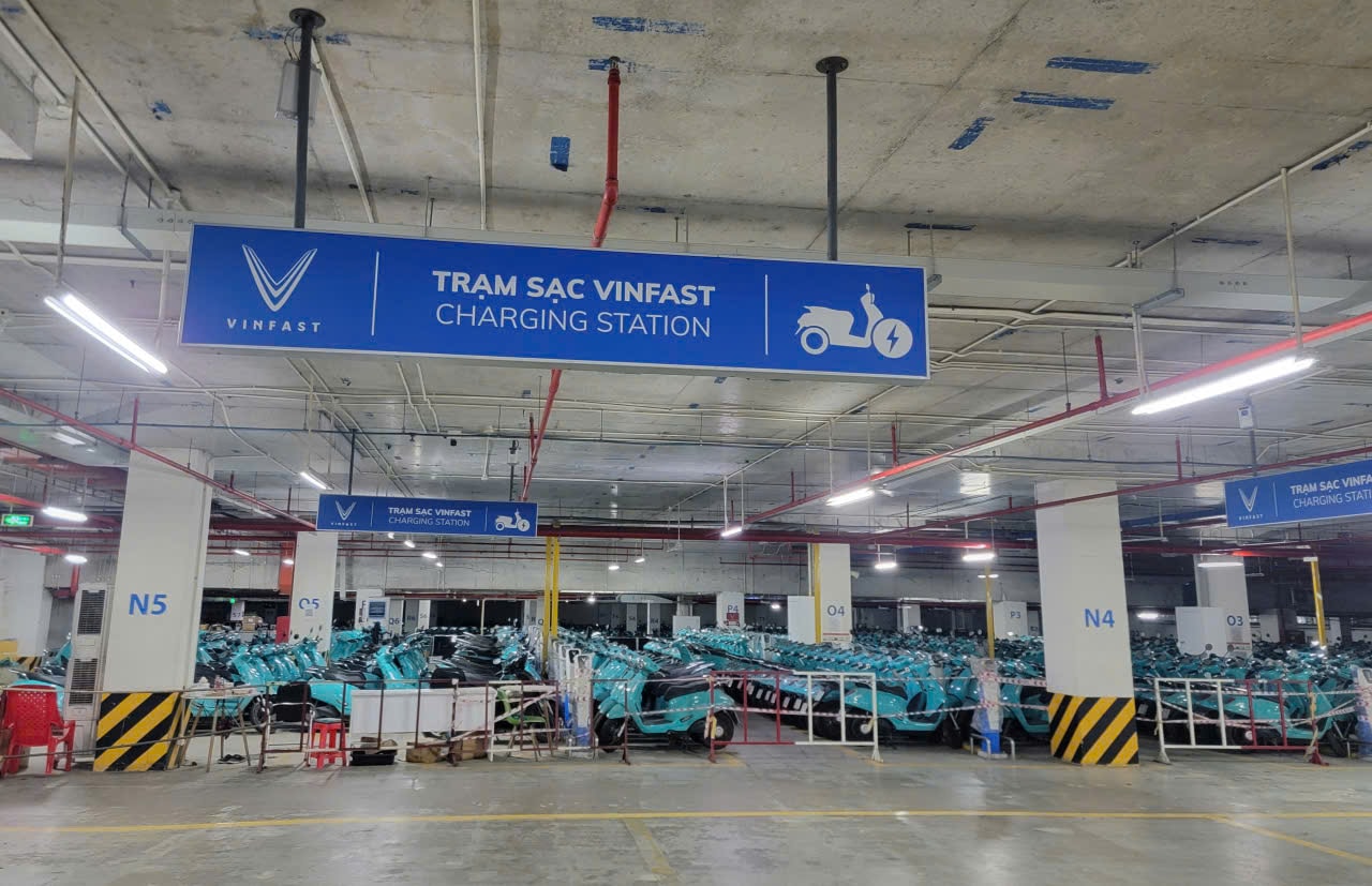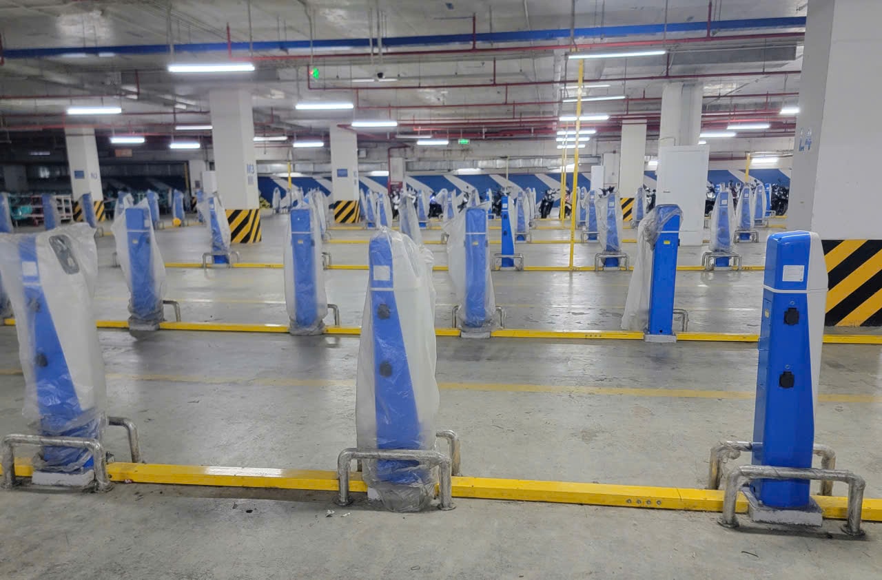 Hệ thống trụ sạc điện cho xe máy điện đặt tại tầng hầm của một trung tâm thương mại trên đường Lê Văn Việt, phường Tăng Nhơn Phú, TP. Hồ Chí Minh. Ảnh: Quang Phương