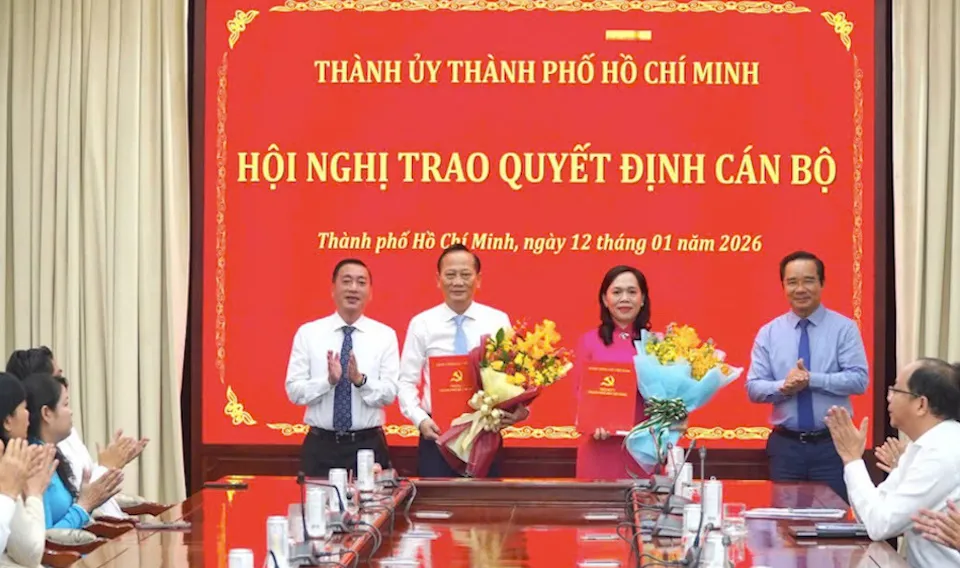 Phó Bí thư Thành ủy, Chủ tịch UBND TP Hồ Chí Minh Nguyễn Văn Được trao quyết định và tặng hoa chúc mừng ông Trần Văn Nam và bà Nguyễn Thanh Xuân nhận nhiệm vụ mới