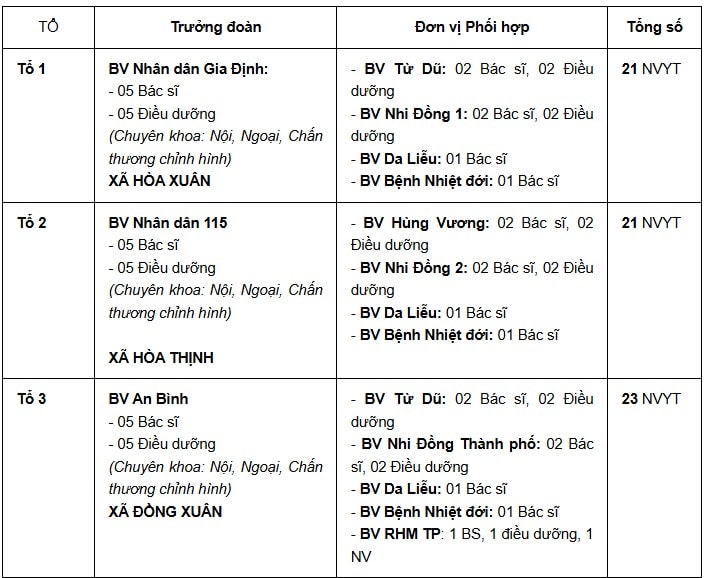 Ngoài ra, trong mỗi tổ, Sở Y tế đã tăng cường nhân lực từ các bệnh viện chuyên khoa của Thành phố, gồm chuyên khoa Sản (Từ Dũ, Hùng Vương), Nhi (Nhi Đồng 1, Nhi Đồng 2, Nhi Đồng Thành Phố), Da liễu (BV Da Liễu) và Nhiễm (BV Bệnh Nhiệt Đới), cùng đội ngũ điều dưỡng, dược sĩ. Sự tham gia đa chuyên khoa nhằm bảo đảm khả năng chăm sóc toàn diện cho người dân vùng lũ, đặc biệt là trẻ em, người già và phụ nữ mang thai – những nhóm dễ tổn thương nhất sau thiên tai.
