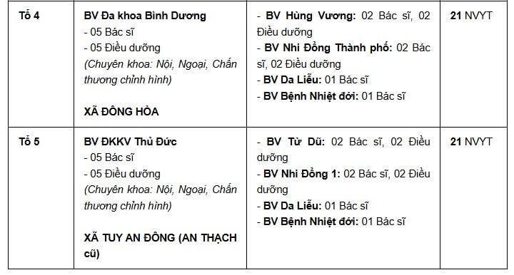 Năm tổ công tác được phân công theo địa bàn và giao cho các bệnh viện tuyến cuối của TP.Hồ Chí Minh làm tổ trưởng, gồm: Bệnh viện Nhân Dân Gia Định, Bệnh viện Nhân Dân 115, Bệnh viện An Bình, Bệnh viện Đa khoa Khu vực Thủ Đức, Bệnh viện Đa khoa Bình Dương. Các đơn vị tổ trưởng đảm trách những lĩnh vực chuyên môn thiết yếu trong thiên tai như cấp cứu – hồi sức, nội khoa, ngoại khoa và chấn thương chỉnh hình.