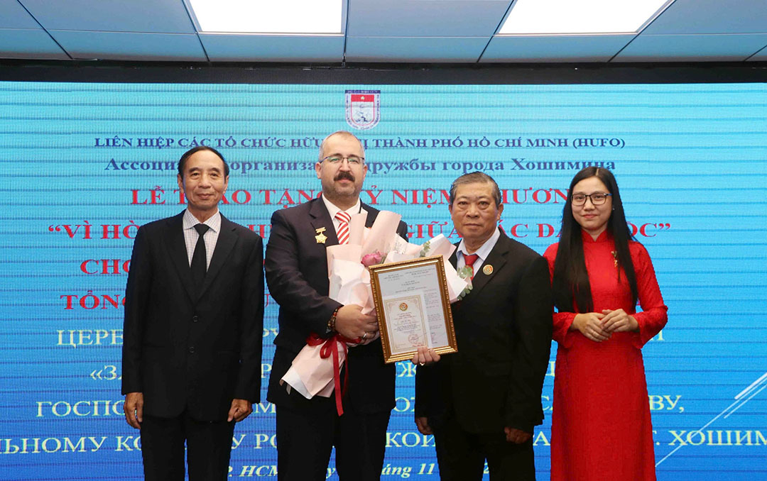 Trao Kỷ niệm chương “Vì hòa bình, hữu nghị giữa các dân tộc” tặng ngài Timur Sirozhevich, Tổng Lãnh sự Liên bang Nga tại TP Hồ Chí Minh, vì những đóng góp tích cực, hiệu quả trong thúc đẩy quan hệ hữu nghị, hợp tác giữa nhân dân hai nước Việt Nam và Liên bang Nga.