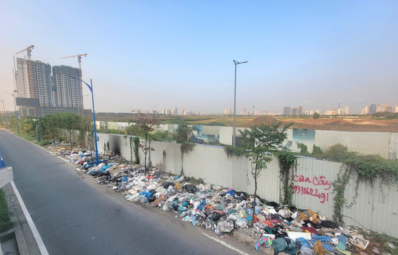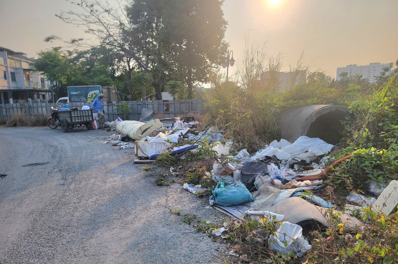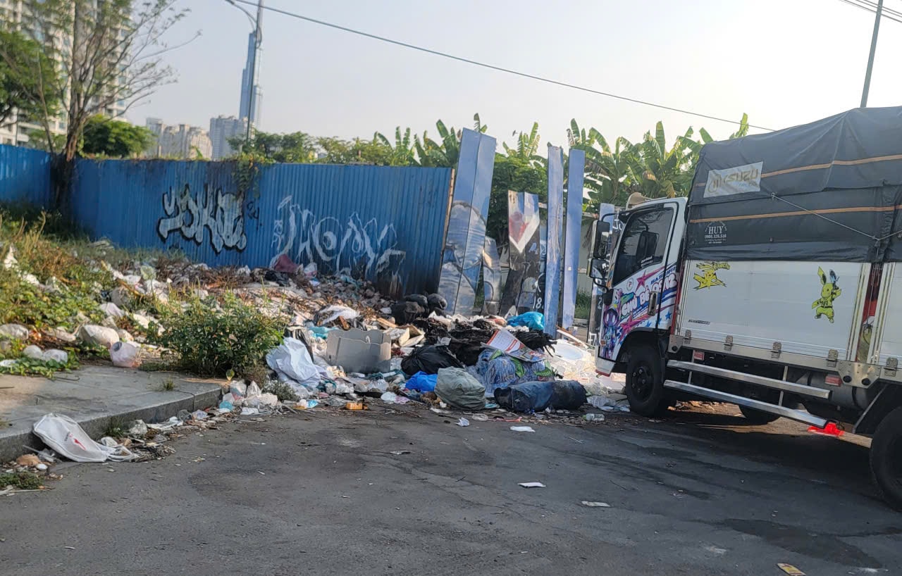 Một bãi rác thải tự phát trên đường Tố Hữu, Khu đô thị mới Thủ Thiêm, phường An Khánh. Ảnh: Quang Phương chụp sáng 10/4